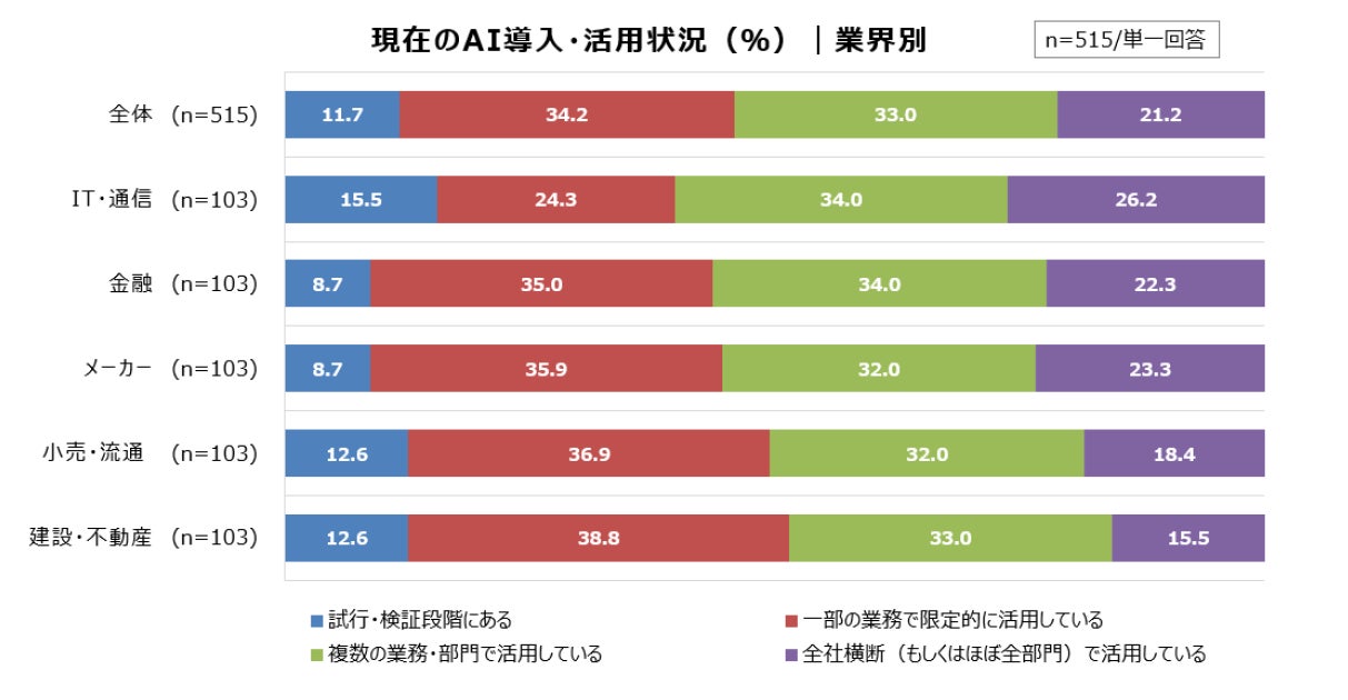 対象 :従業員数501人以上 AIツールを導入・活用している企業において、人事もしくは採用にかかわる22~69歳の担当者515人(IT通信、金融、メーカー、小売・流通、建設・不動産から各103サンプル)