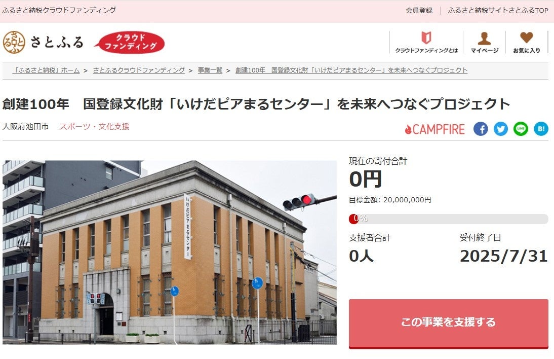 大阪府池田市とふるさと納税ポータルサイト「さとふる」を運営する株式会社さとふる(本社:東京都中央区、代表取締役社長 兼 CEO:藤井 宏明)は、「さとふるクラウドファンディング」にて、「創建100年 国登録文化財『いけだピアまるセンター』を未来へつなぐプロジェクト」の寄付受け付けを2025年5月16日より開始します。