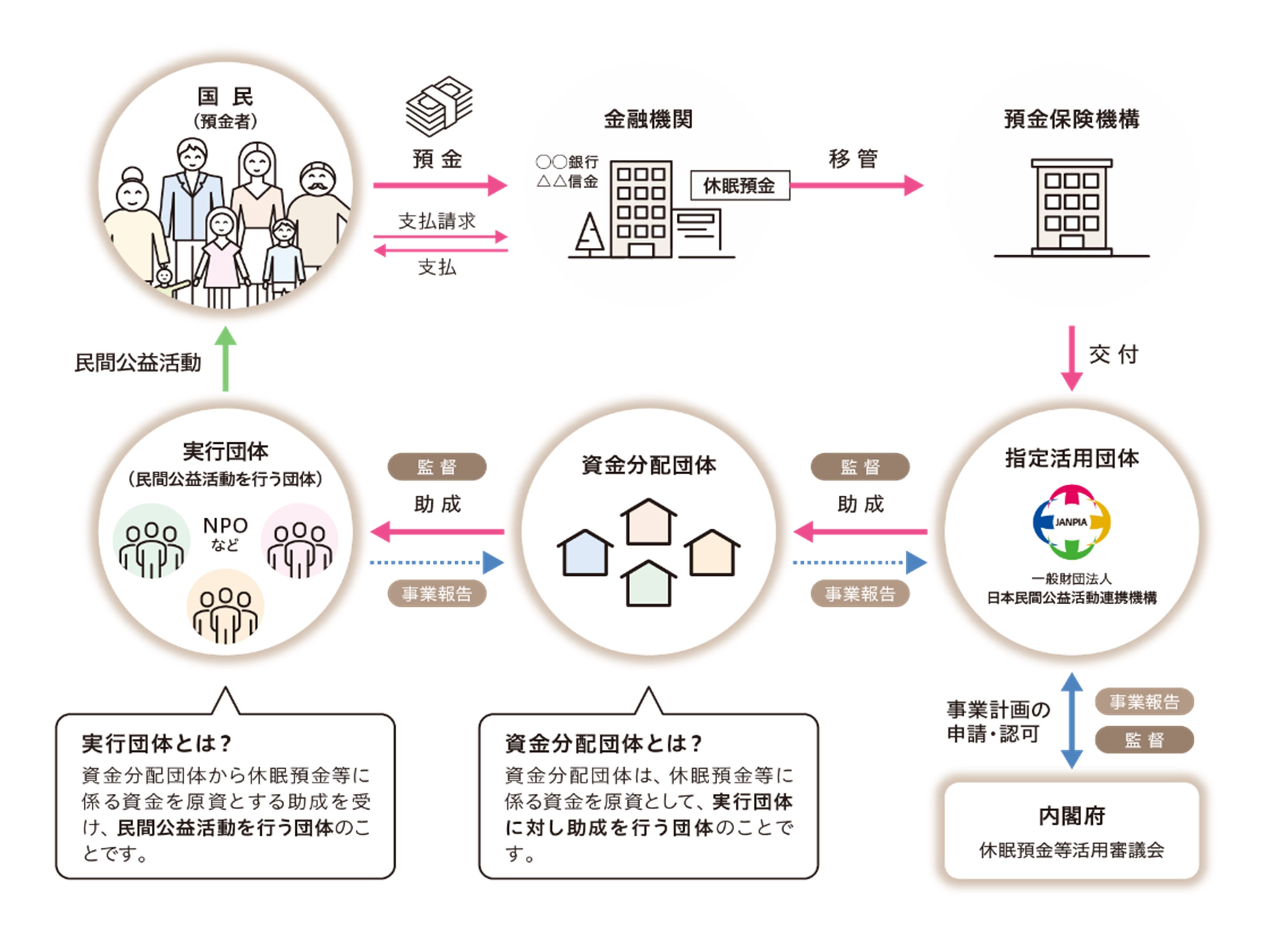 [休眠預金の流れ(JANPIA ウェブサイトより)]