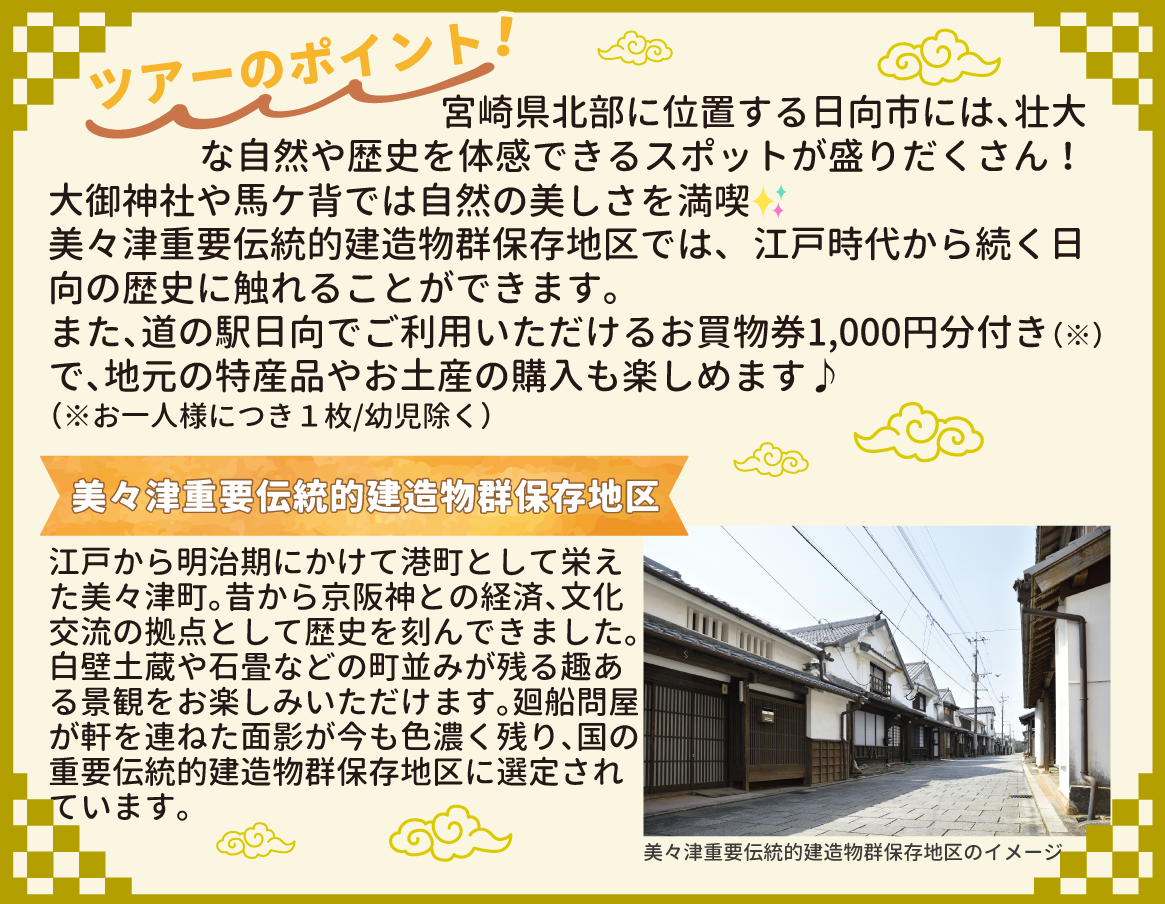 本ツアーでは、「日向のお伊勢さま」と呼ばれる大御神社での参拝、太平洋を望む馬ヶ背、美々津の歴史ある町並みを訪れます。昼食には、鮎の塩焼きや旬のヒラメのお刺身、さらにレタス巻きなどの宮崎グルメをご堪能いただけます。道の駅日向でご利用いただける1,000円分のお買物券付き!
