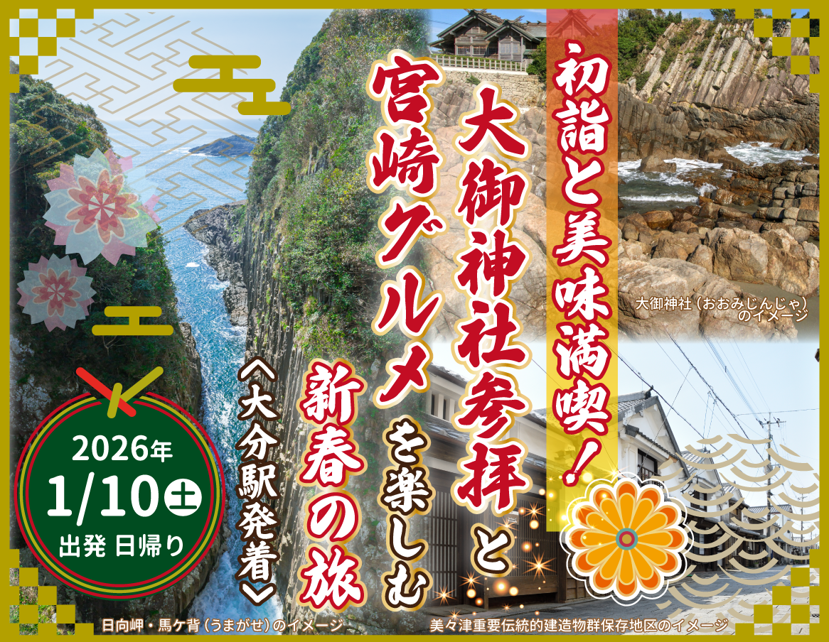 日帰りツアー「初詣と美味満喫!大御神社参拝と宮崎グルメを楽しむ新春の旅(大分駅発着)」を発売中!