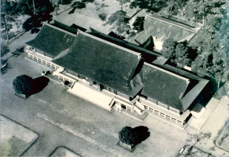 これとは対照的に、江戸東京たてもの園そして小金井公園の地は、時代の要請により独特な役割が期待され、大きく変貌をとげた場所でした。式殿から始まり光華殿、ビジターセンターと改称されていった建物とその周辺に設置された国民錬成所、東宮御仮寓所、武蔵野郷土館などの施設。これらは江戸東京たてもの園の地にかつてあった建物・施設の名称です。そのひとつひとつに昭和ならではの時代背景がありました。