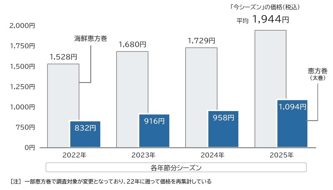 前年と比較できない恵方巻があるため、一部前年調査から対象が変更となっている。なお、入れ替え対象の恵方巻について2022年まで遡って価格データを再集計した。