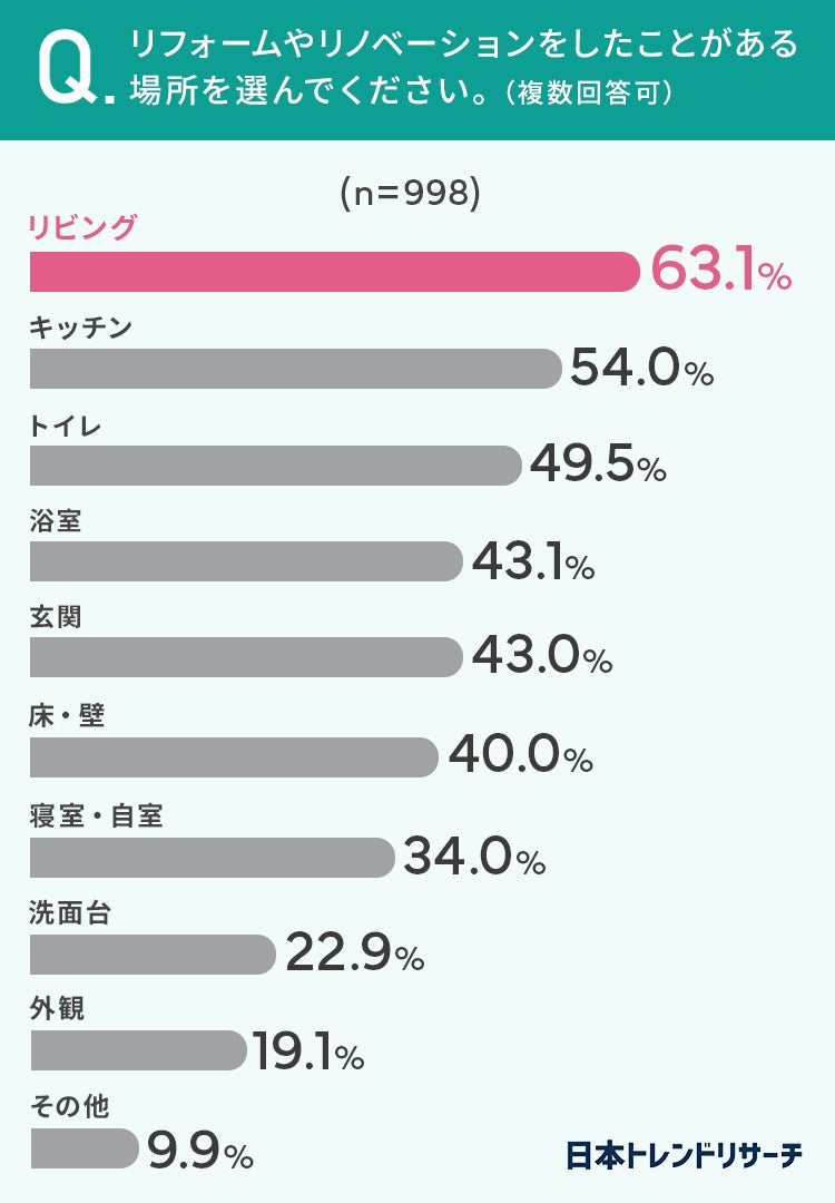 ■リフォームやリノベーションをしたことがある場所は「リビング」が63.1%で最多に