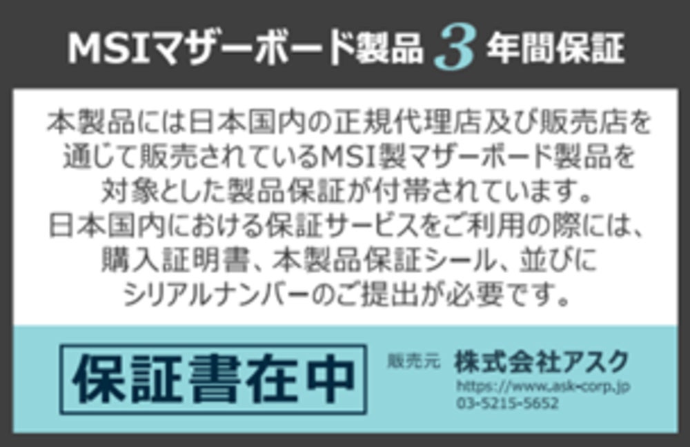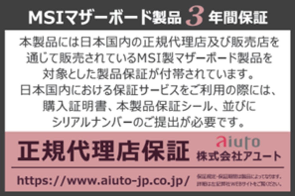 本製品保証サービスは、MSI正規代理店である株式会社auitoおよび株式会社アスクが取り扱うMSIマザーボードが対象で、代理店の製品保証シールがパッケージに貼られ、保証書が同梱されています。並行輸入品や個人輸入品は対象外となります。また、液体窒素等を用いたオーバークロックによる、過剰な電源供給により、CPUソケットにダメージを負った製品やユーザーの過失による物理破損等も保証対象外です。サービスの詳細については、以下をご参照ください。