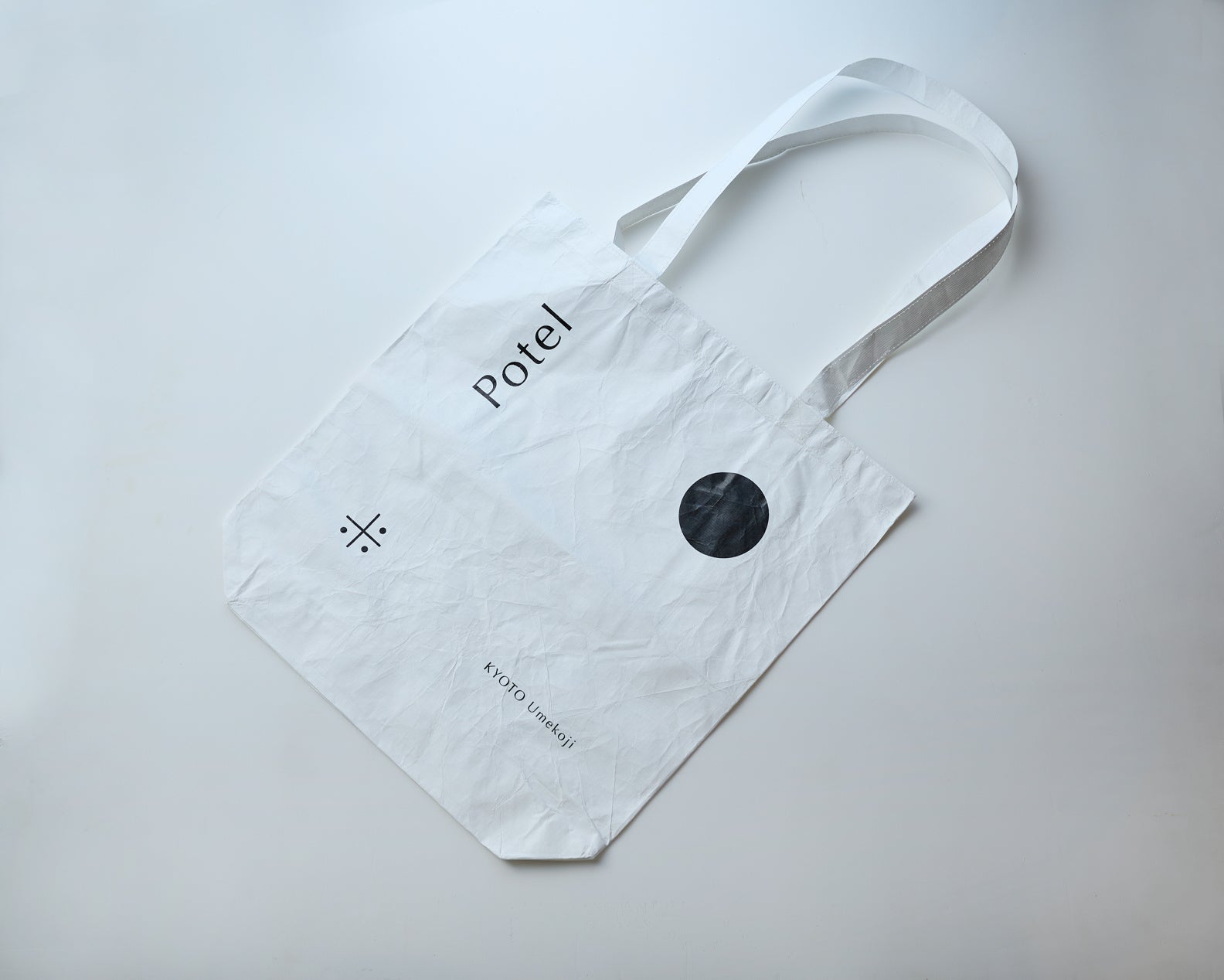 ポテルのロゴ入りバッグ。これは宇宙服にも使われる素材を利用したバッグだから驚くほど軽くて丈夫!お買い物やお出かけにはもちろんですが、サウナやプールにも活躍します。くるくると丸めて簡単に持ち歩けるのもポイント。
