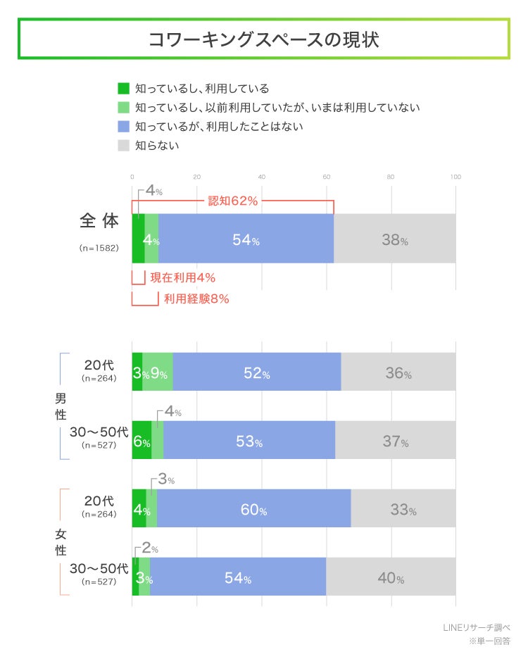 【LINEリサーチ】コワーキングスペースの認知率は約6割。利用意向のある人は全体の25%、現在利用率は4%