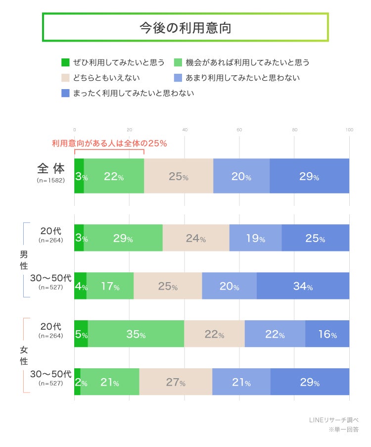 次に、今後の利用の意向について回答してもらったところ、利用意向がある人の割合(「ぜひ利用してみたいと思う」「機会があれば利用してみたいと思う」の合計)は全体で25%となりました。