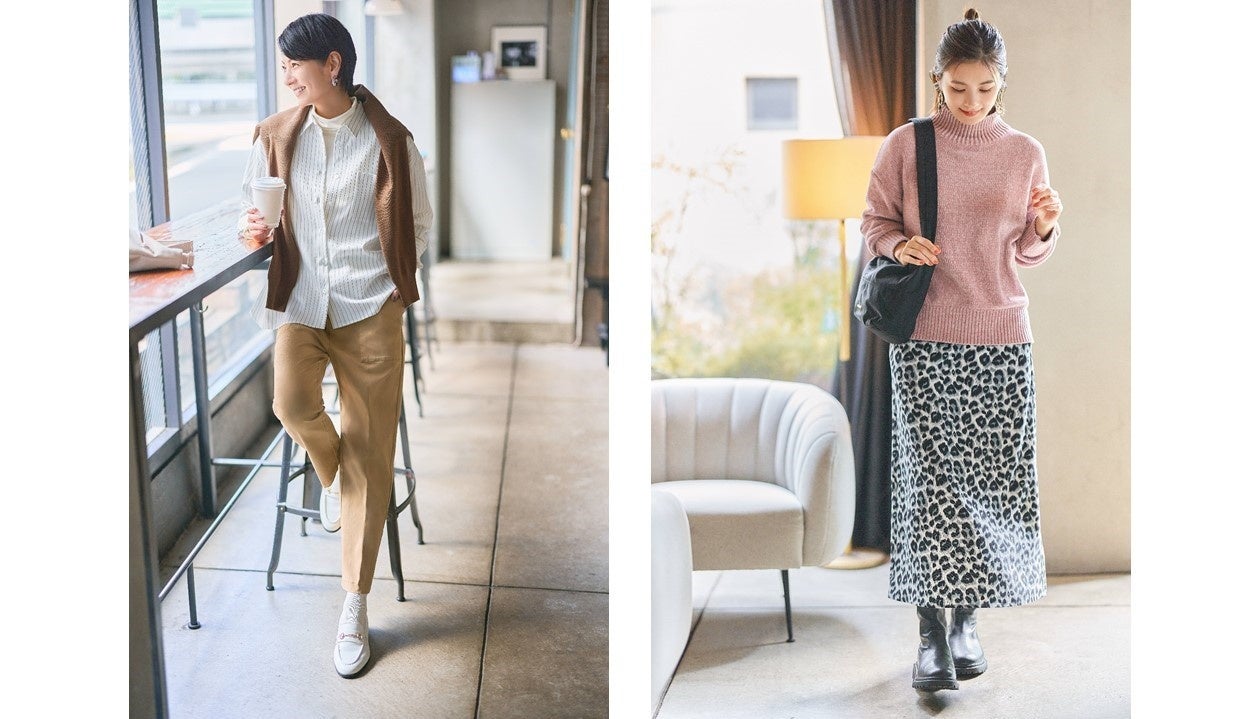 洗えるモールハイネックニット2,980円(税込3,278円)、レオパード柄ナロースカート3,980円(税込4,378円)