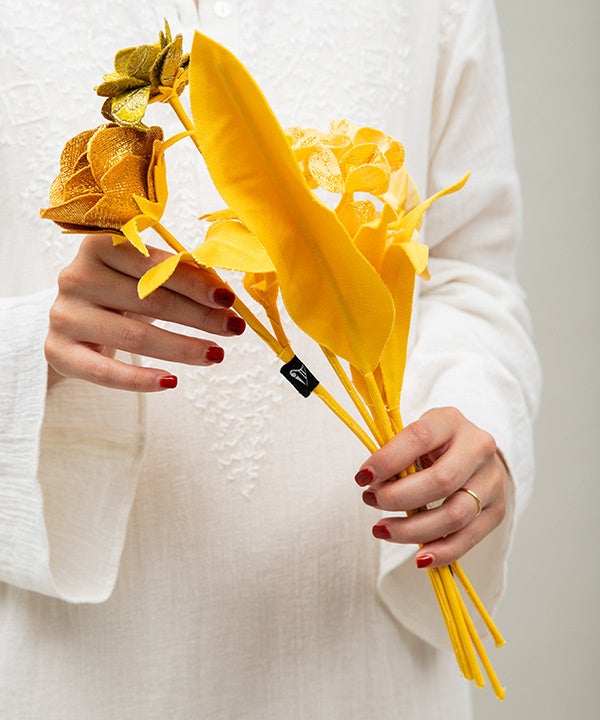 劇団四季の生地を贅沢に使用したテキスタイルフラワーのブーケ。