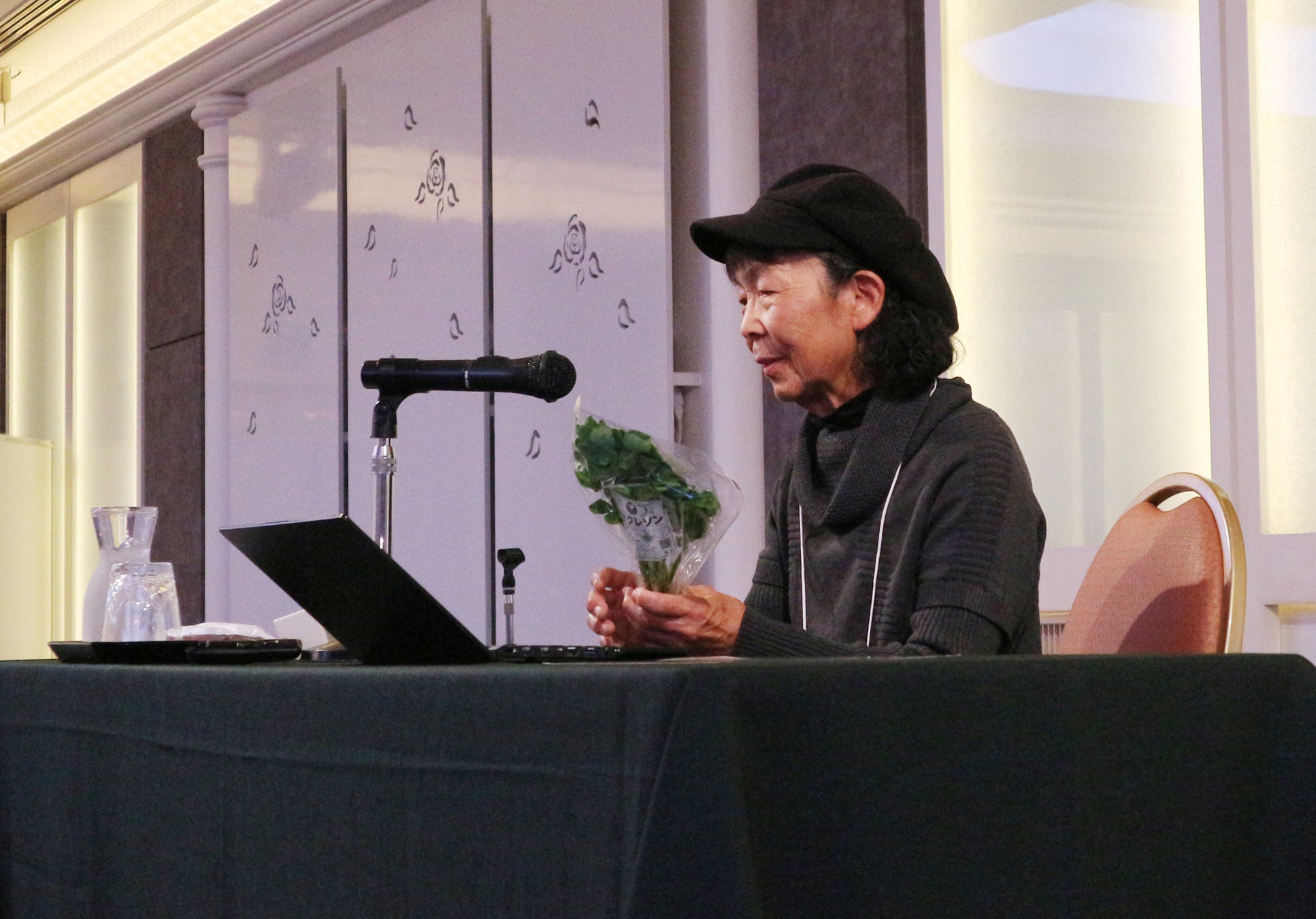 フランス大使館のシェフに「日本にこんなに美味しいクレソンがあるのか」と驚かれたエピソードや、どんなに辛い時でも「寝る時はニコッとする」という自身の健康法も紹介しました。中垣さんの逞しさと温かい人柄に、会場からは感嘆の声と拍手が送られました。