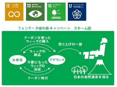 「フォンテーヌ 緑の森キャンペーン」は、期間中にウィッグ回収にご協力いただいたお客様の売上の一部を利用し苗木の植林を行うものです。植林支援は、環境コミュニケーションを推進する「ツバルの森」を通じて行われ、2009年の活動開始以降、環境保全面積は累計28,389㎡(東京ドーム半分以上の面積)となり、活動の範囲も年々広がっています。
