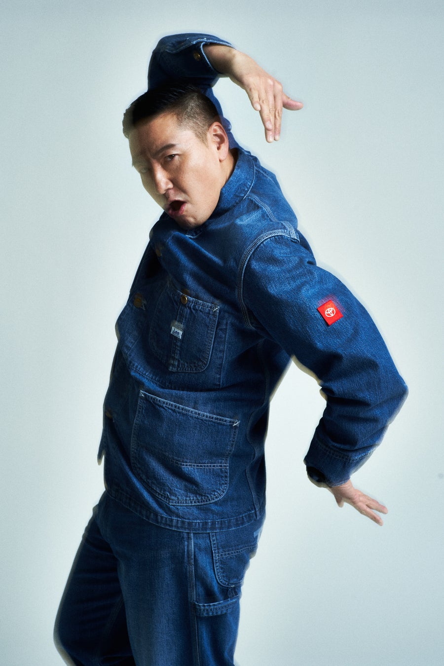Leeとのコラボデニムセットアップ、オーバーオールを着こなす2人や、Fruit Of The LoomのTシャツを着用する2人、更にはTOYOTA DYTDオリジナルアパレルを着る2人など様々な着こなしが今回のルックから見られる。