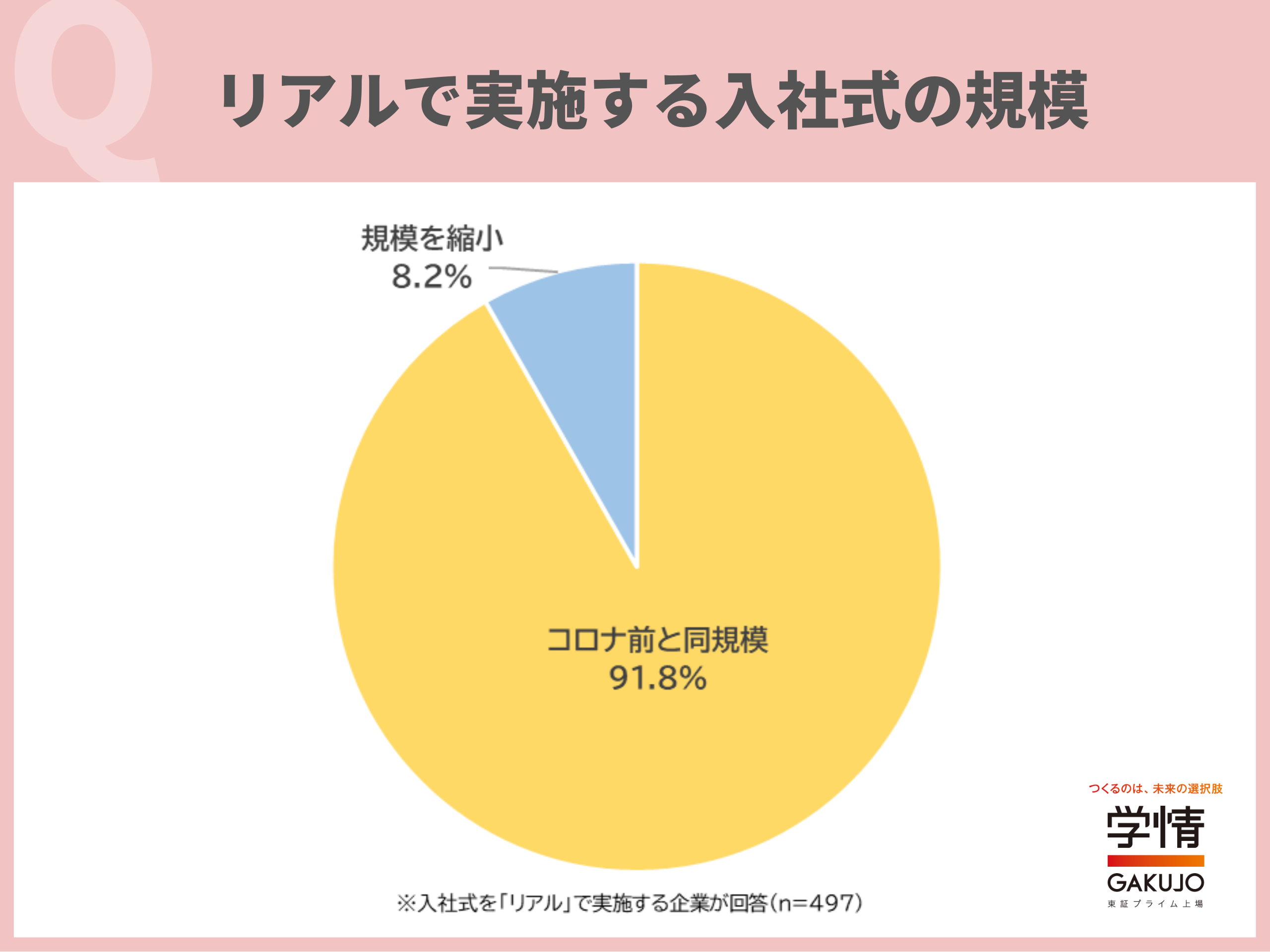 「リアル」で入社式を実施する企業の91.8%が、「コロナ前と同規模」で実施予定と回答しました。「2020年~2022年はオンラインでの開催や、規模を縮小しての開催としてきたが、今年はコロナ前と同規模で実施を予定している」「2019年4月に実施した入社式と同規模で実施する」といった声が寄せられました。