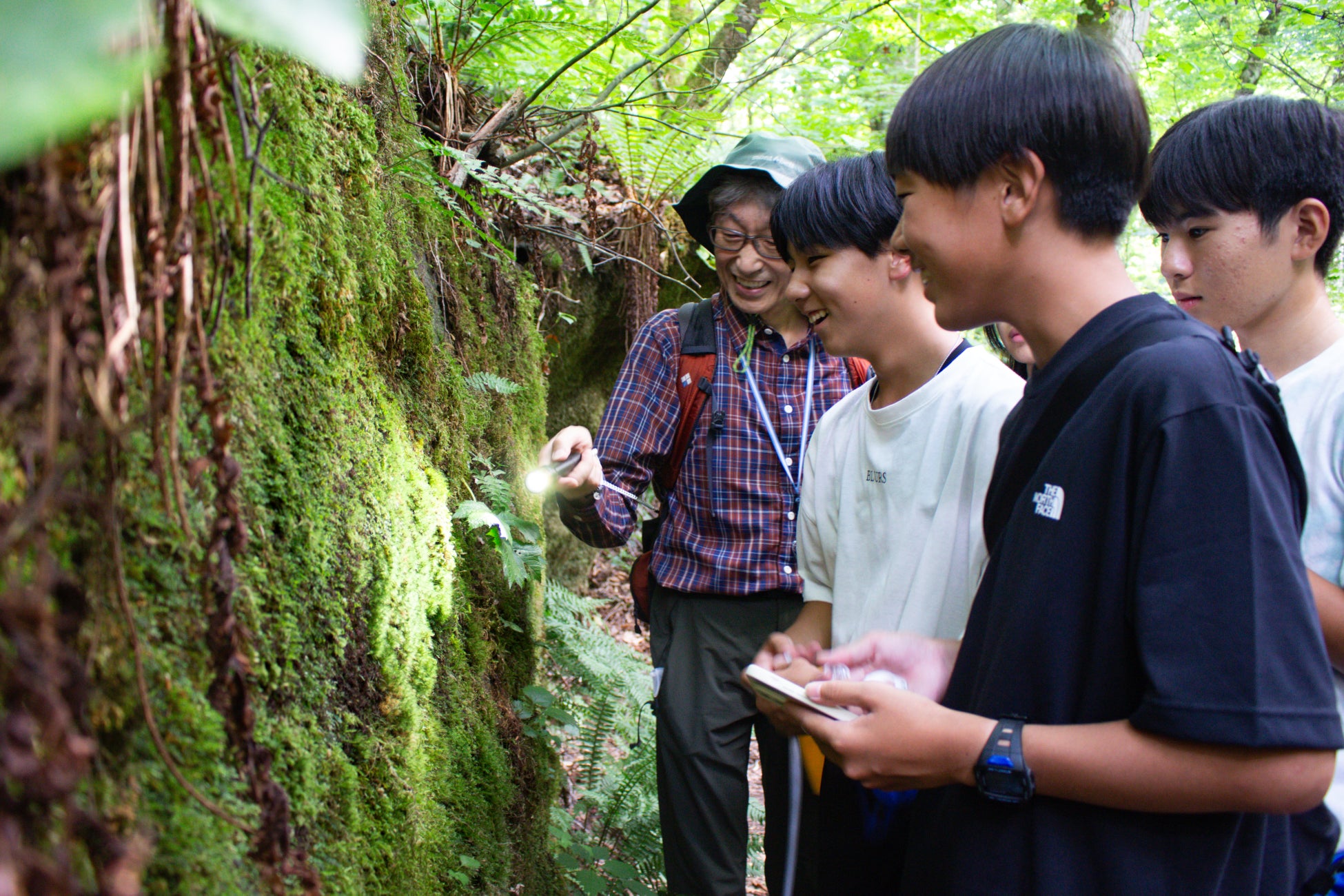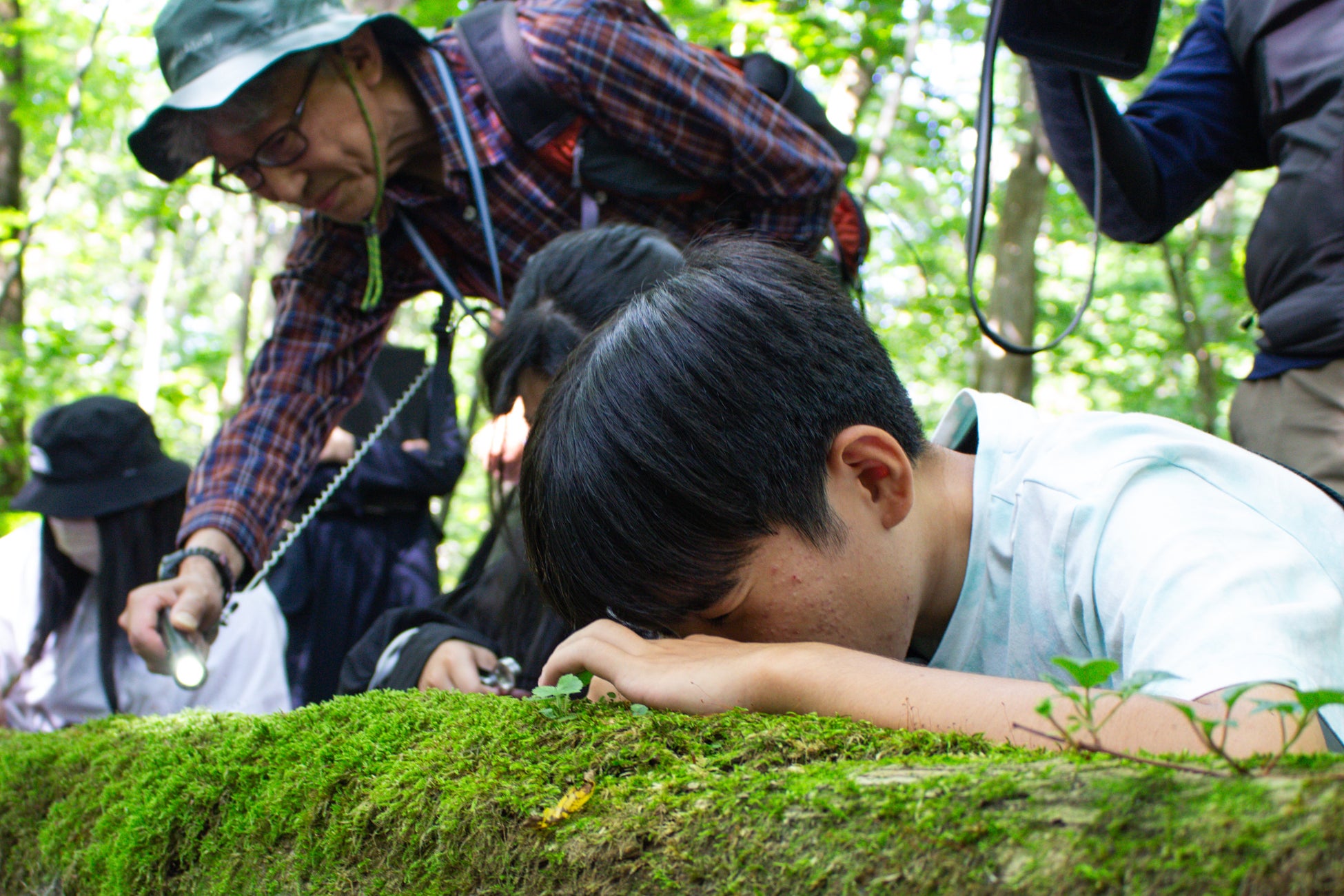 「おいらせコケバス」のユニークなデザインを楽しんだあとは、奥入瀬渓流に出かけました。生徒たちは、おいけんのネイチャーガイドの案内のもと、大きな岩や倒木など、奥入瀬渓流の至る所に生えているコケを、ルーペを通じてじっくりと観察する「コケさんぽ」を楽しみました。生徒たちが苔観察を行ったのは、奥入瀬渓流の名所である「雲井の滝」と「白銀の流れ」です。触れると独特の匂いがしたり、よく見ると透明な色をしていたりするコケのユニークな生態を熱心に学びました。