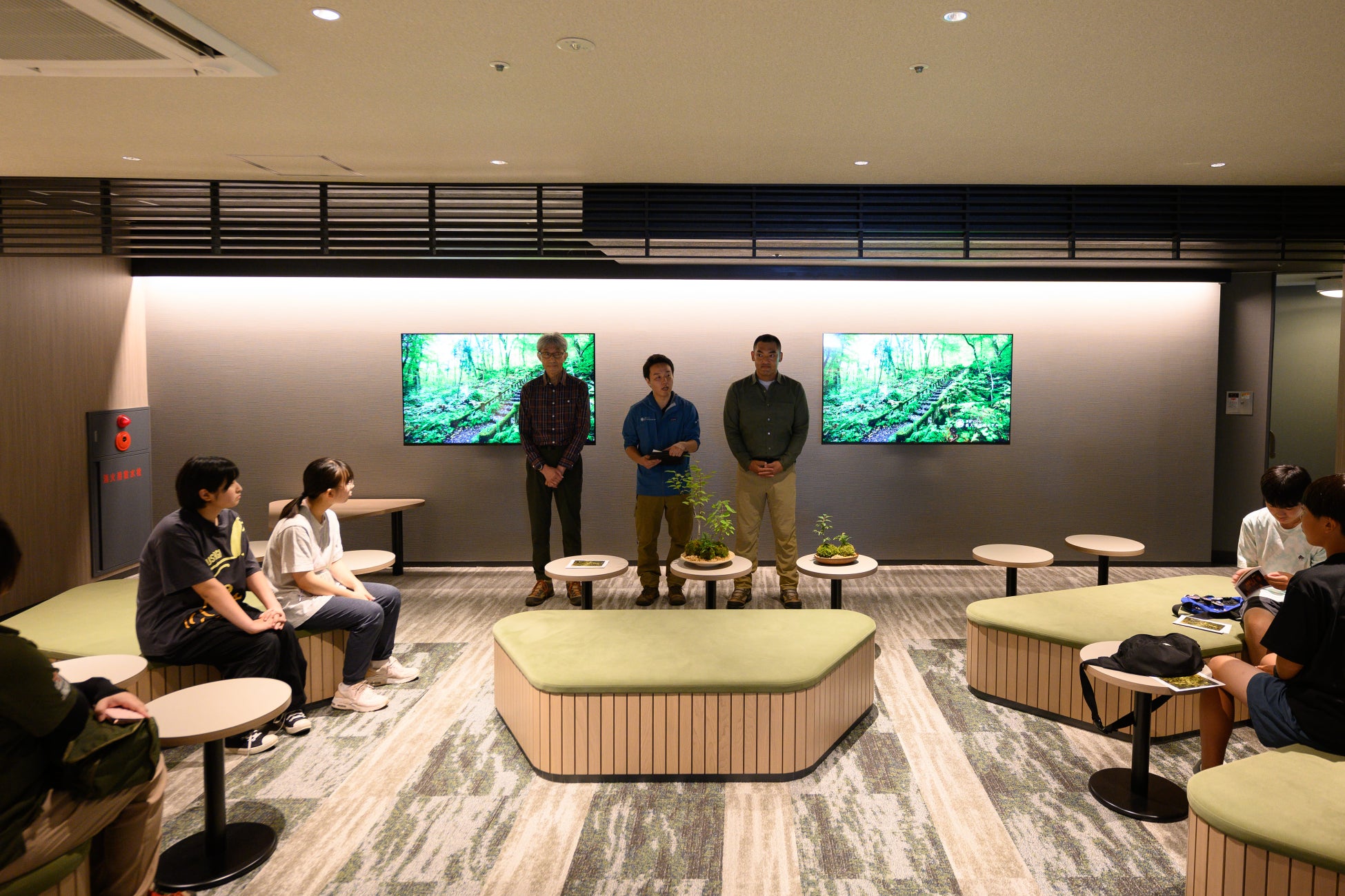 当日集まったのは、地元十和田市にある中学校に通う生徒たちと、その保護者、そして苔を通して、地域の観光を支えてきた事業者です。まず、NPO法人奥入瀬自然観光資源研究会(以下おいけん)、奥入瀬モスボール工房、当ホテル渓流コンシェルジュより、各事業所での取り組みを紹介しました。生徒たちは、「コケさんぽ」や「こけ玉作り体験」など、各事業所ごとに、異なる苔の楽しみ方を生み出していることを学び、地域の観光や、苔についての理解を深めました。