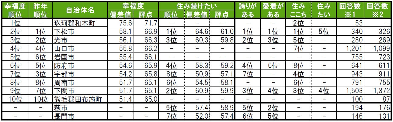 •幸福度・住み続けたい・誇りがある・愛着があるの順位が「-」と表示されているのは、累計回答数が50名未満だったためランキング集計対象外となっている場合です。また、偏差値50未満の場合も「-」と表示しています。