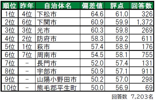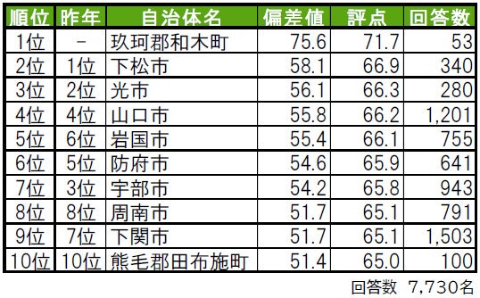 1位は、唯一偏差値70台の高い評価を得た玖珂郡和木町です。和木町は「住みここち」2位の街で、昨年は累計回答数が50名未満でランキング集計対象外でした。2位は下松市で、「住みここち」「住み続けたい街」「街に誇りがある」「街に愛着がある」1位、「住みたい街」5位と各ランキングで高い評価を得ています。3位は光市で、「街に誇りがある」2位、「住み続けたい街」「街に愛着がある」3位、「住みここち」5位となっています。
