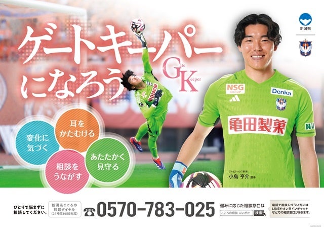 新潟県福祉保健部障害福祉課は、社会全体の課題である自殺を防止するための取り組みのひとつとして、「ゲートキーパー」の普及啓発に取り組んでいます。このたび、当クラブ所属の小島亨介選手を起用いただいたゲートキーパーの普及啓発ポスターが完成しましたので、お知らせいたします。当クラブでは、2020年から新潟県と連携して自殺防止のための普及啓発に取り組んでおり、今年で5年目となります。