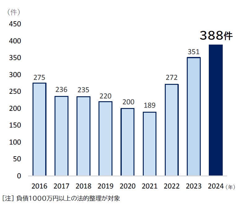 2024年の「コンプライアンス違反倒産」は388件となり、2023年を37件(10.5%増)上回った。3年連続で前年比増となり、2年連続で300件を超え、過去最多を記録した。