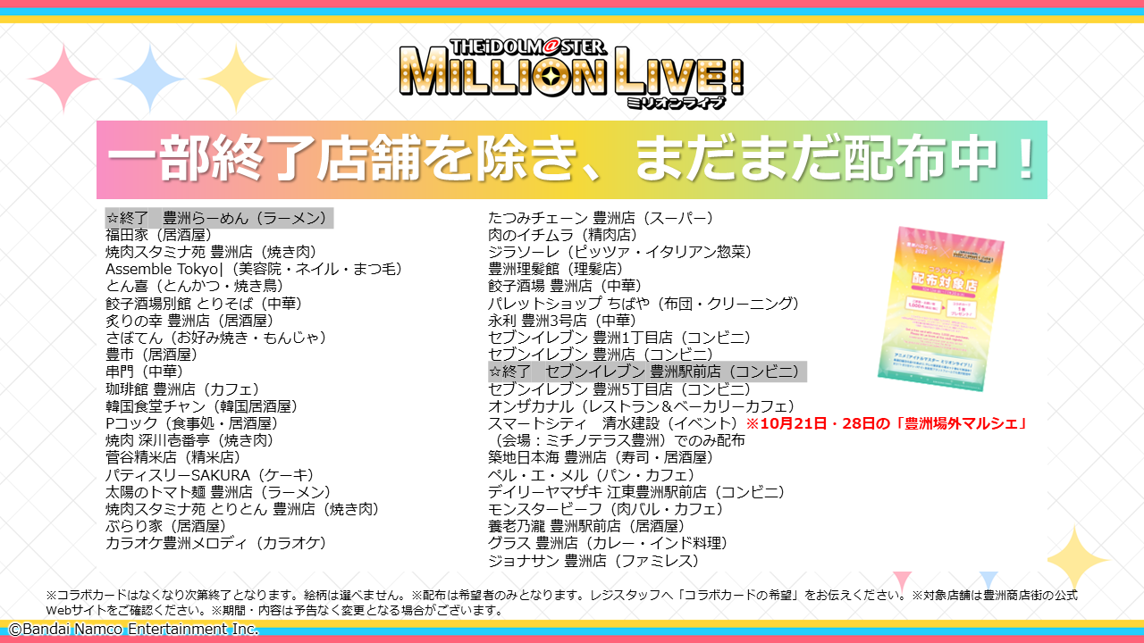 期間中、豊洲商店街の飲食店やコンビニ、精米店や理髪店まで、様々なお店でコラボカードを配布しております。