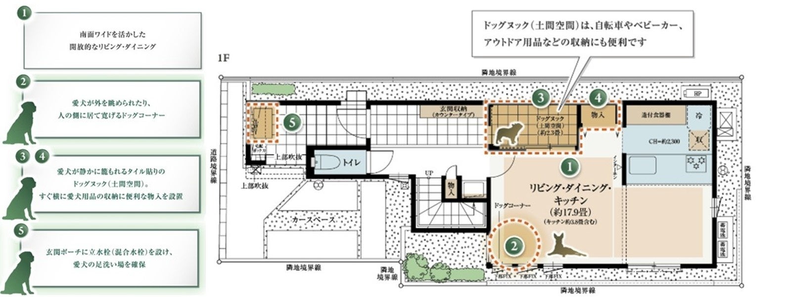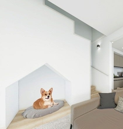 本物件の、「犬も人も楽しく快適に暮らすための工夫を随所に取り入れた戸建て住宅を提案する」というコンセプトは、人間中心に設計された既存の分譲住宅とは異なり斬新で、大変興味をもって設計段階からご相談に加わらせていただきました。基本的に犬は仲間との関わりを求める社会性の高い動物ですが、個性豊かでもあり、家庭での愛犬との生活スタイルも、ご家族ごとに様々です。そのため本物件の設計に当たっては、ただ単に愛犬の居場所をスペースとして確保するだけにとどまらず、寂しがり屋の犬でも独立心の強い犬でも性質によって居場所を選べるようにする、さらに複数飼いとなった場合や家族構成が変化した場合でもフレキシブルに活用できるような間取りとなるようにしました。