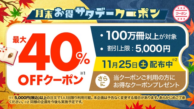 電子書籍販売サイト「ebookjapan」をLINEヤフー株式会社と協力して運営する株式会社イーブックイニシアティブジャパンは、「ebookjapan」で40%OFFクーポンがもらえる「月末お得サタデー」を11月25日(土)に実施します(上限5,000円、1人1回、5,000円以上のご注文でご利用可)。この機会に、気になっていたマンガをぜひお楽しみください。
