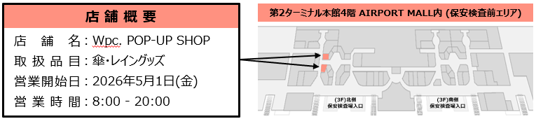 2026年5月1日(金)、成田空港第2ターミナル本館4階 AIRPORT MALL内に、傘やレイングッズを取り扱う「Wpc. POP-UP SHOP」 が期間限定でオープンいたします。