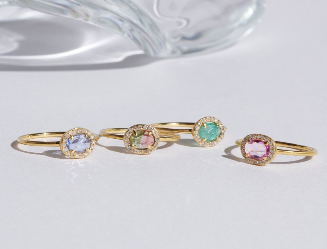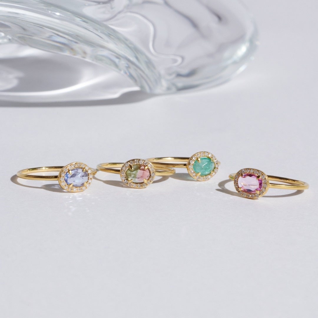 ブルーサファイア、ウォーターメロントルマリン、エメラルド、ピンクサファイアの艶やかで豊かな色彩を讃えるように、絢爛なパヴェのホワイトダイヤモンドで取り巻いたスペシャルなリング。澄んだ煌めきで、指元を美しく彩ります。