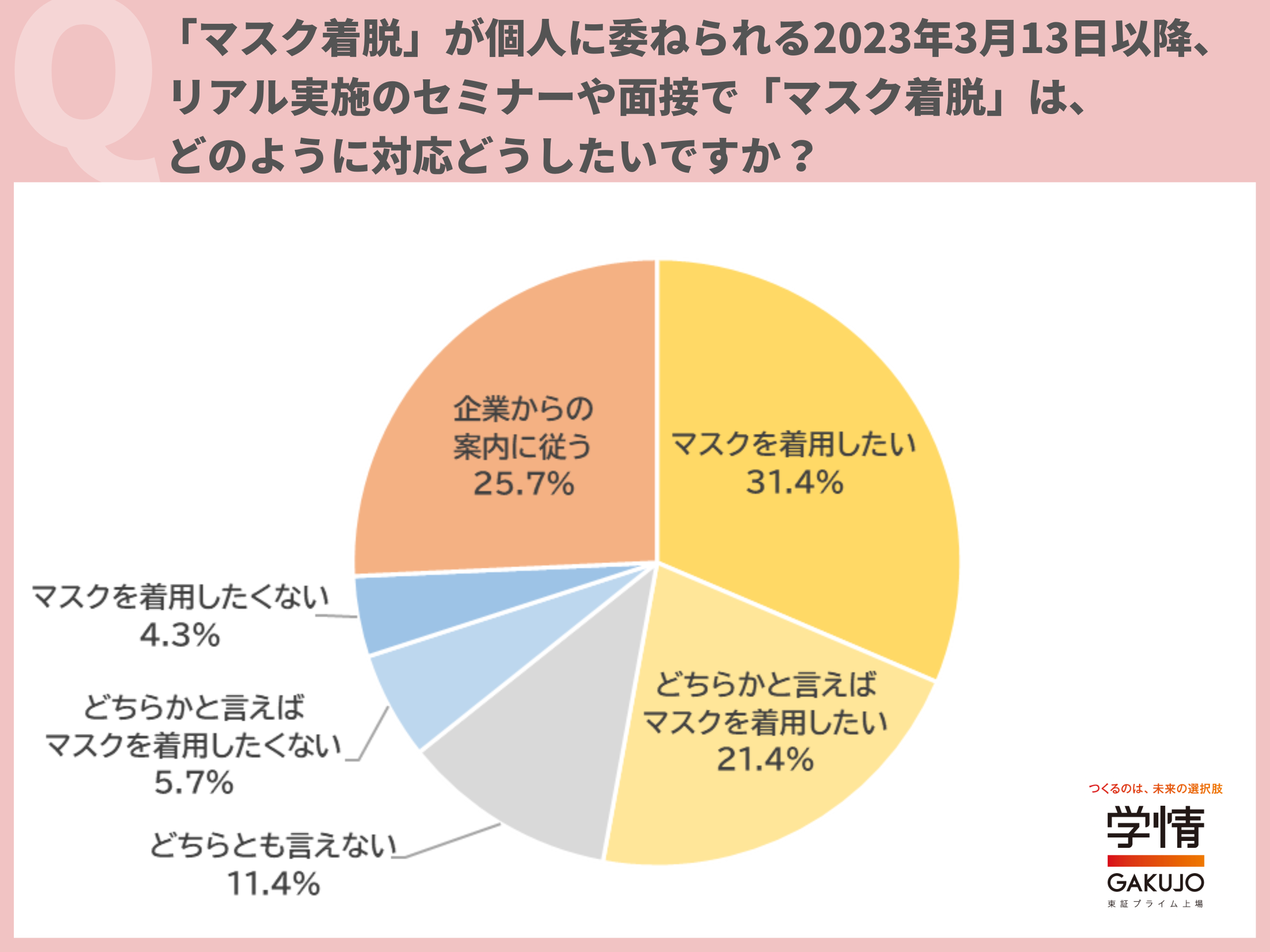 屋内でも「マスク着脱」が個人に委ねられる2023年3月13日以降、就職活動のセミナーや面接において「マスクを着用したい」と回答した学生が31.4%に上りました。「どちらかと言えばマスクを着用したい」21.4%を合わせると、半数以上の学生がマスクの着用を希望していることが分かります。「これまでマスク生活だったので抵抗がある」「就職活動の大切な時期に体調を崩したくないので、感染を予防したい」といった声が寄せられました。「企業からの案内に従う」は25.7%、「マスクを着用したくない」「どちらかと言えばマスクを着用したくない」は10.0%でした。「マスクを着用したくない」とした学生からは、「マスクがないほうが、表情が分かりやすいと思う」「面接で笑顔を見てもらったほうが、熱意を伝えることができると思う」といった声が上がりました。