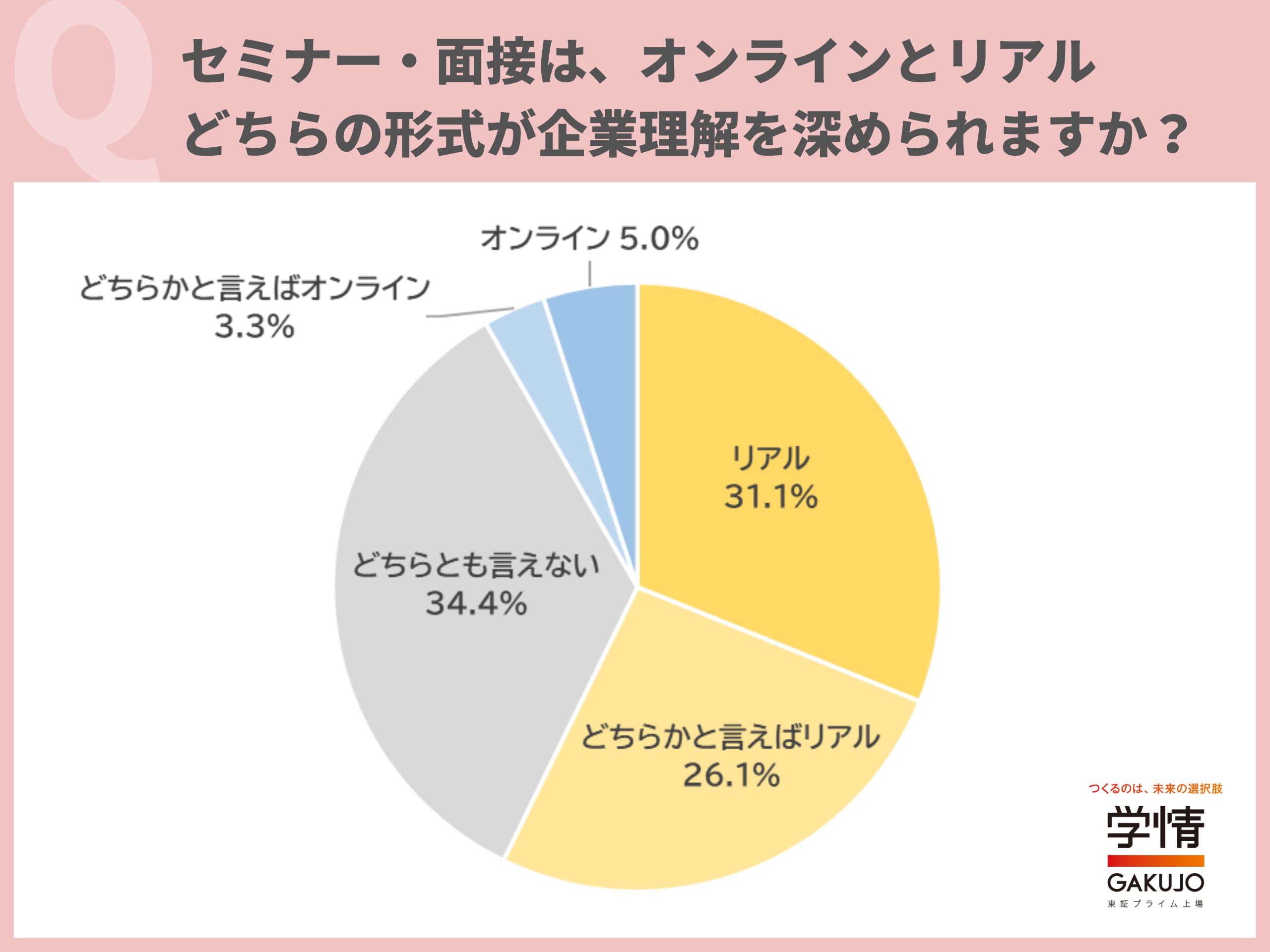 「オンラインとリアルどちらの形式が、企業理解を深められますか?」という質問に対し、「リアル」「どちらかと言えばリアル」と回答した学生が57.2%に上りました。「直接社員の方と話すことで社風を理解することができる」「実際に企業に訪問することで、働くイメージが湧いた」「その場で感じたことを質問することができる」といった声が寄せられています。