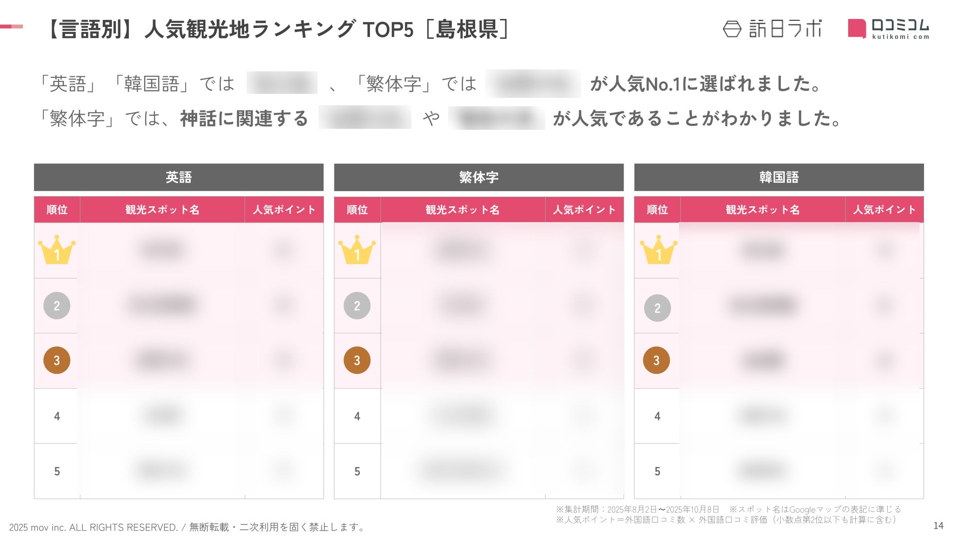業界最大級のインバウンドビジネスメディア「訪日ラボ」及び 店舗向け集客一元化プラットフォーム「口コミコム」を運営する株式会社mov(代表取締役:渡邊 誠、本社:東京都渋谷区、以下mov)は、島根県の観光地に寄せられた最新の口コミデータから、独自の『インバウンド人気観光地ランキング』を発表しました。