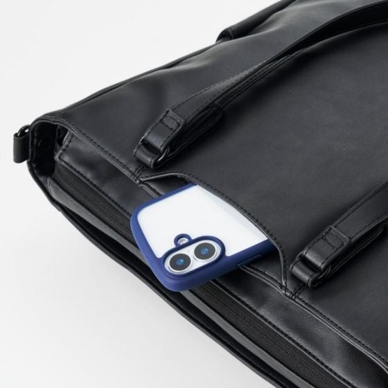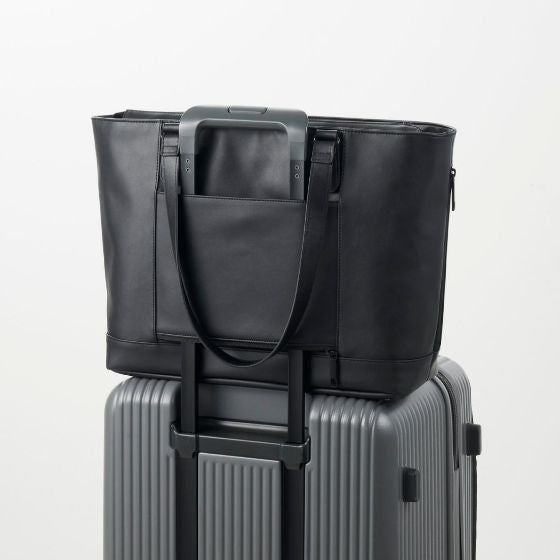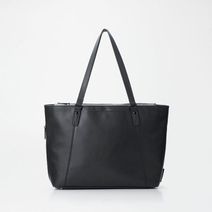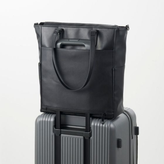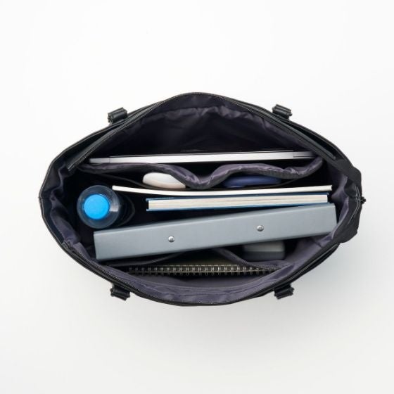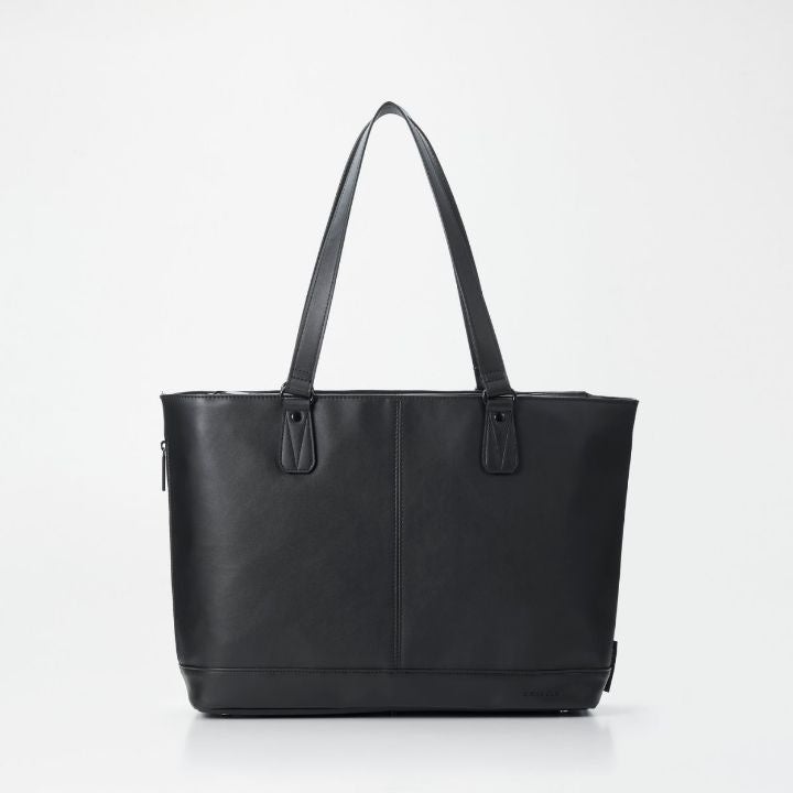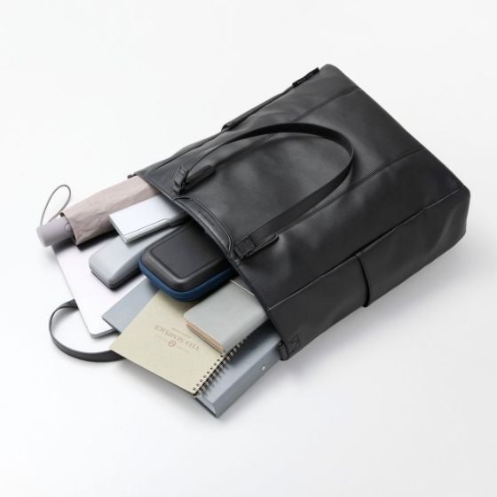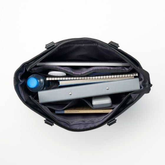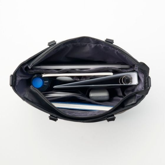 A4サイズ対応の収納力を備えたビジネストートバッグで、横型2タイプと縦型1タイプをご用意しています。14.0インチのパソコン(※)が収納できるクッションポケットをはじめ、ボトルポケット、ファスナーポケット、あおりポケットなどを備え、バッグ内の整理に便利です。また、縦型はショルダーベルト付きの2Way仕様で、シーンに合わせて持ち方を選べます。いずれもブラックで統一されたシックなデザインで、通勤から休日まで幅広いシーンでお使いいただけます。