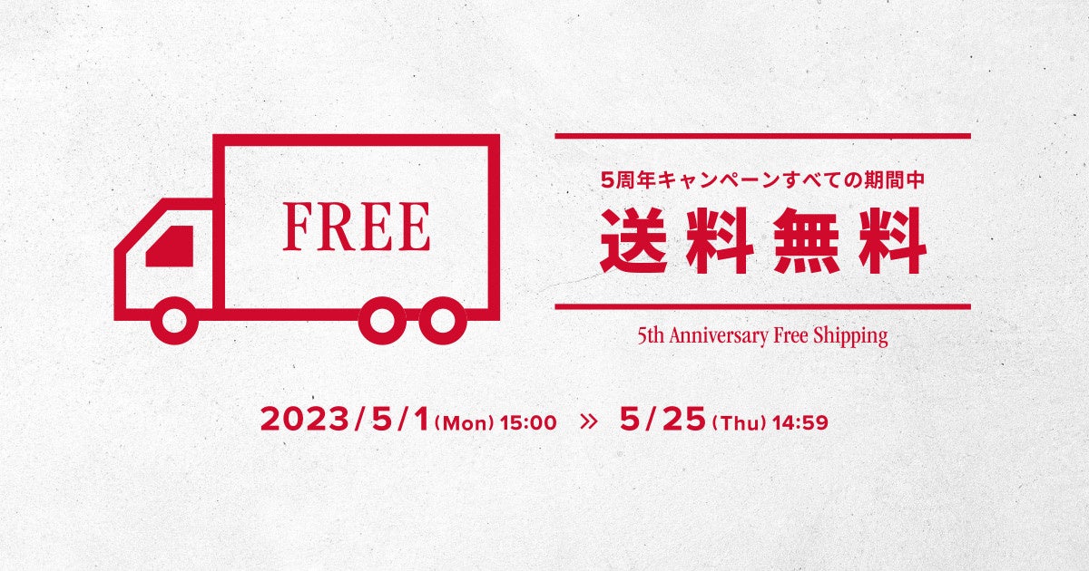 5周年キャンペーン開催中のすべての期間中は、通常5000円(税込)以上お買い上げで送料無料のところ全てのお買い物が送料無料になります。この機会にぜひショッピングをお楽しみください。