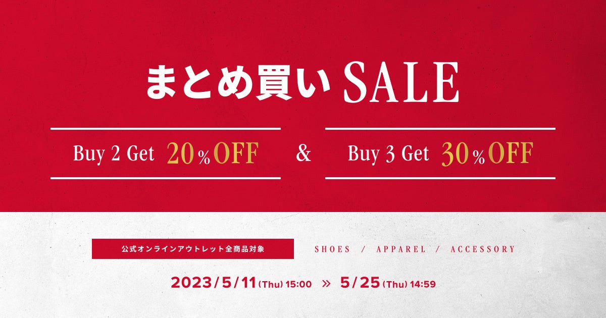 公式オンラインアウトレット全商品を対象に、2点のお買い上げで20%OFF、3点以上のお買い上げで30%OFFとなるまとめ買いセールを開催いたします。