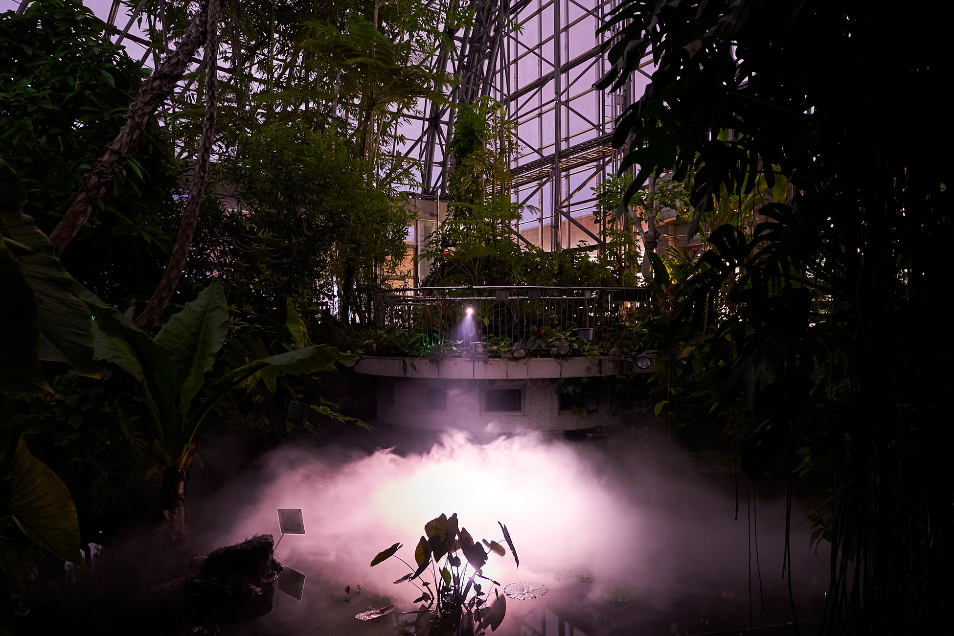 夜の夢の島熱帯植物館を舞台に、3日間限定で体験型インスタレーション 「Aerosculpture ver.2『匂う森』」 が開催されました。本展覧会は、夜のバイオームを舞台に、「共生」をテーマとした体験型インスタレーション作品です。