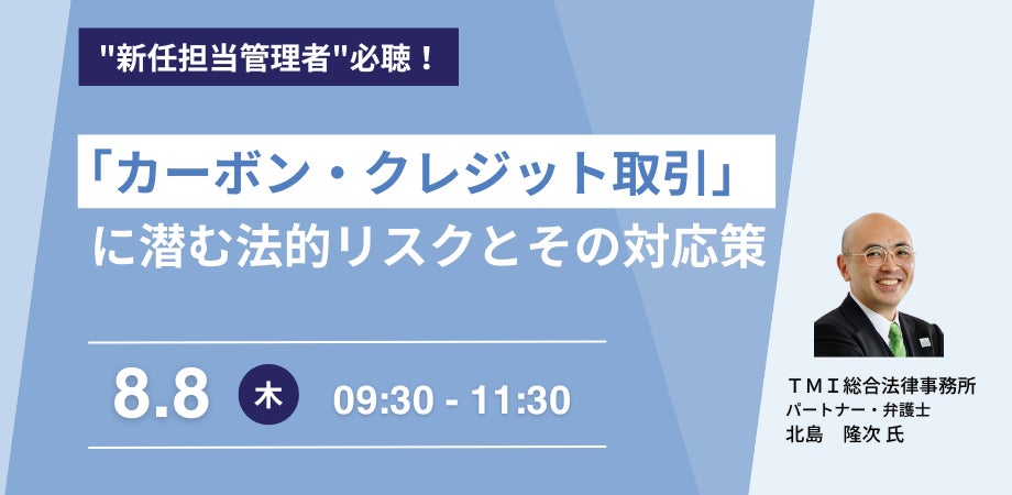 JPI(日本計画研究所)は、TMI総合法律事務所 パートナー・弁護士 北島 隆次 氏を招聘し、カーボン・クレジット取引に関して、基礎的な知識から、カーボン・クレジット取引の法的リスクや取引契約書上の留意点について詳説いただくセミナーを開催します。