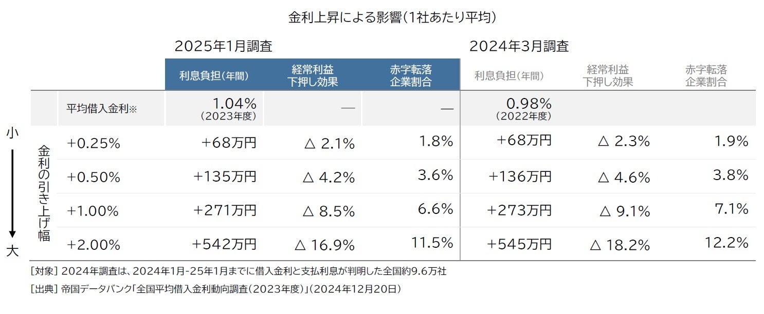 帝国データバンクは、保有する企業データベースのうち2024年1月-25年1月間に決算を迎えた企業財務データを対象に、企業の借入金利引き上げに対する影響度について調査・分析を行った。各平均値は、上下各5%、計10%のトリム平均値を使用した。