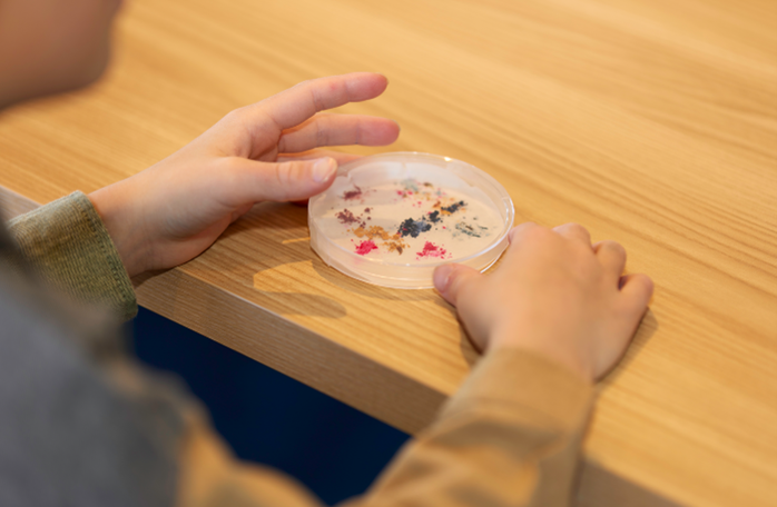 会場では、粘菌の不思議な生態に触れる「粘菌ワークショップ」、微生物の働きを学ぶ「細胞粘土ワークショップ」、食とアートを融合させた「バターづくりとパンケーキアート体験」など、子どもから大人まで楽しめる多彩な体験プログラムを実施。科学を“学ぶ”だけでなく、“感じる・つくる・味わう”を通して体感できる内容となりました。