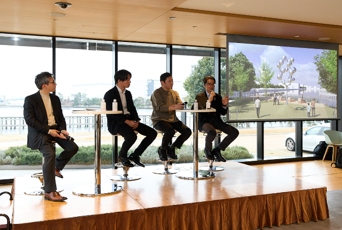 設置を記念して、3月13日(金)に三井リンクラボ新木場3コミュニケーションラウンジにてトークセッション『新木場で考える アート×サイエンス イノベーションを生み続ける街へ』を一般社団法人ライフサイエンス・イノベーション・ネットワーク・ジャパン(理事長:岡野 栄之、以下「LINK-J」)共催にて実施。イベント当日には、E&K Associates代表の長谷川一英様をモデレーターに迎え、名和晃平様、三井リンクラボ新木場2に入居されている株式会社Dioseve代表取締役社長の岸田和真様、当社常務執行役員イノベーション推進本部長の山下和則が登壇。彫刻作品のお披露目とともに、サイエンスとアート思考の共通点や産業とアートが融合することで生まれる新しいイノベーション環境、そして三井不動産が描く次世代のまちづくりの可能性について語りました。