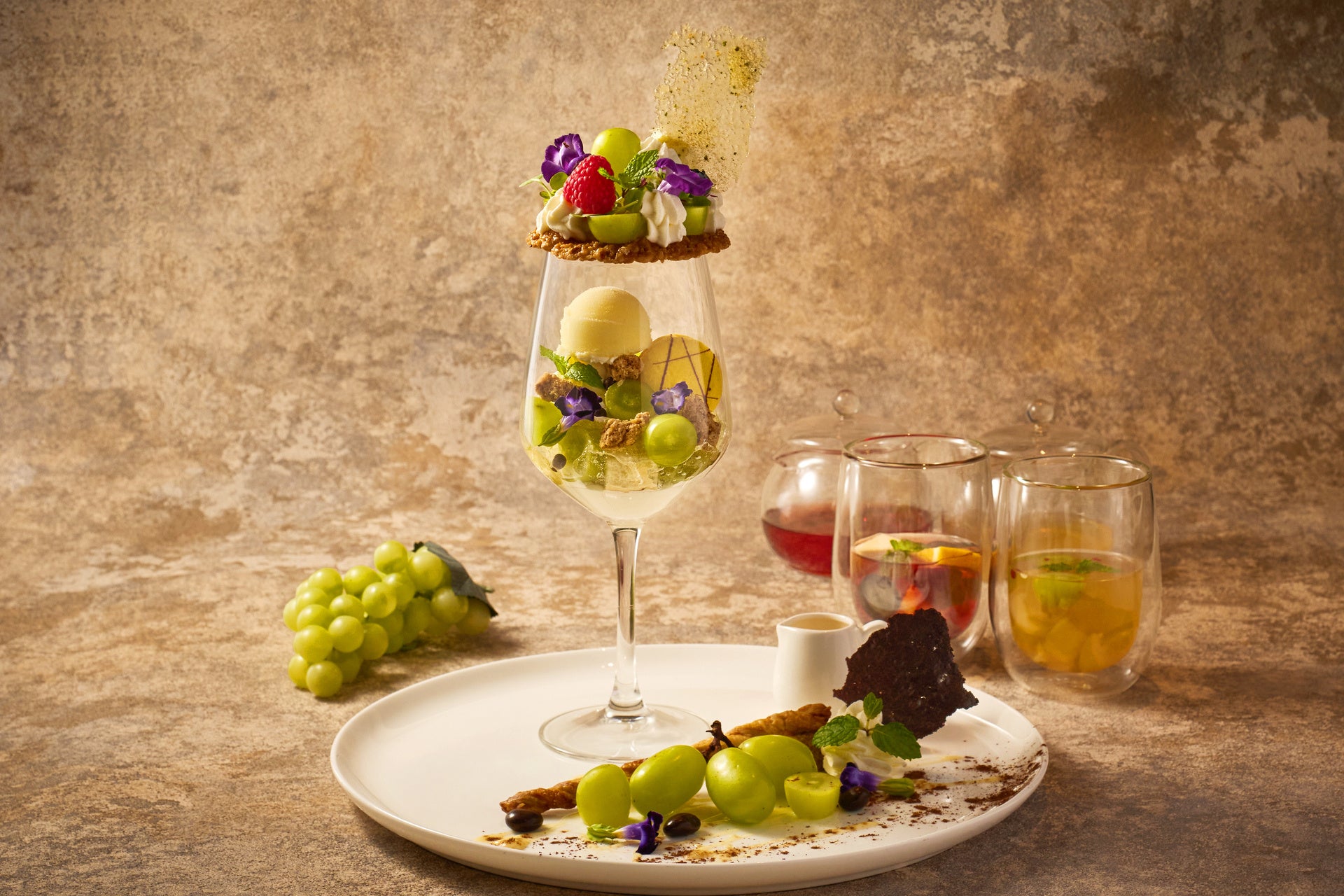 価格:シャインマスカットのパフェ 3,800円 / フルーツを使った自家製ホットワイン(赤・白)各1,400円 ※提供時間は2商品ともに11:00~22:00