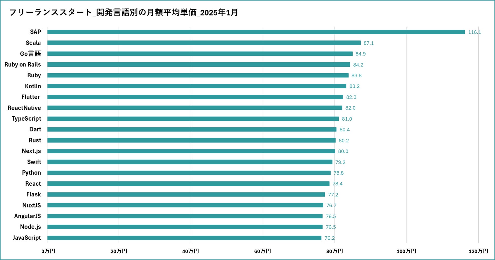 また、言語別では前述のランキングには含まれませんでしたが、「jQuery」の67.3万円(前月比+2.4万円・3.7%増)、次いで「ReactNative」が82.0万円(同+2.2万円・2.8%増)、「Flask」が77.2万円(同+1.4万円・1.9%増)でした。各言語の掲載案件数も増加しており、主要言語に留まらずフロントエンド、モバイルアプリ、そしてバックエンドと各分野での需要が確認できます。