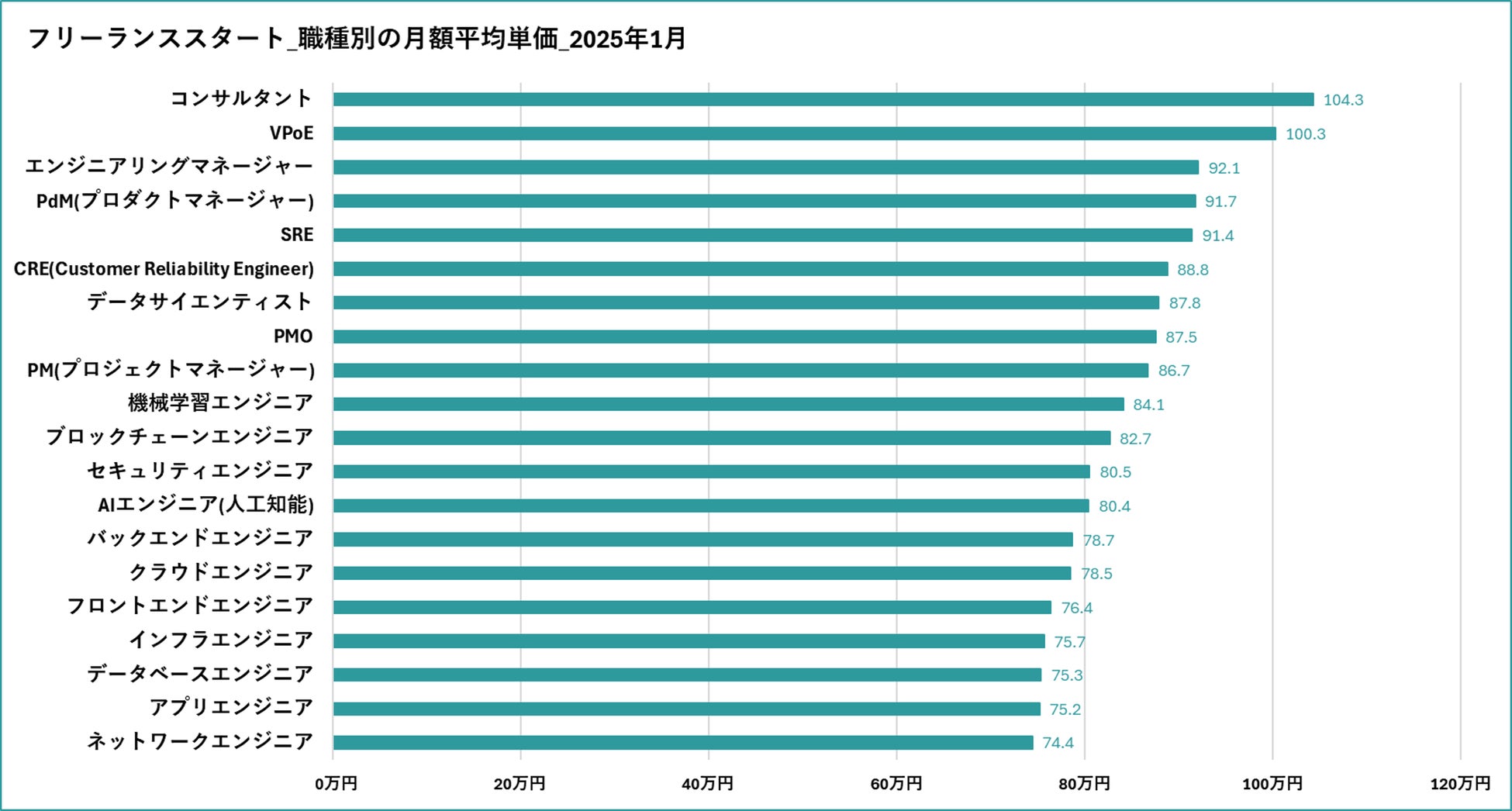 月額平均単価のトップ3は、1位「コンサルタント」が104.3万円(前月比+7.4万円・7.6%増)、2位「VPoE」が100.3万円(同-9.9万円・9.1%減)、3位「エンジニアリングマネージャー」が92.1万円(同+1.1万円・1.1%増)でした。
