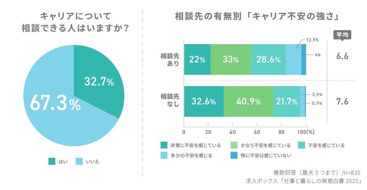 ・キャリア不安を相談できる人が「いない」人が約7割。相談先の有無で不安スコアに明確な差