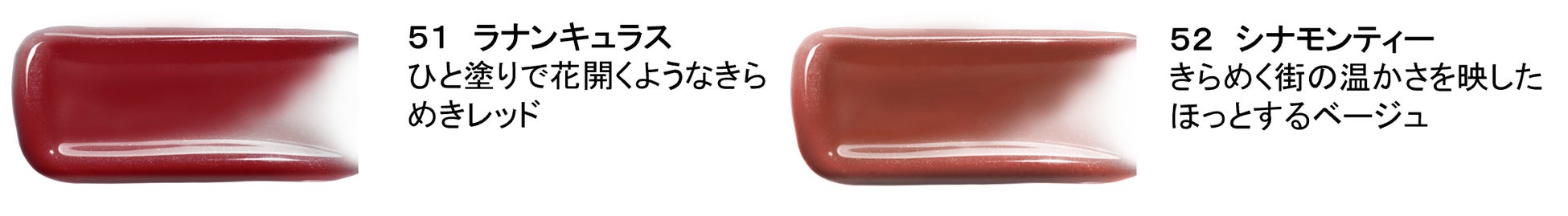 深みのあるきらめきレッド「ラナンキュラス」と、温かみのあるベージュ「シナモンティー」の2色展開で、ホリデーシーズンにもおすすめのラメ入りカラーです。