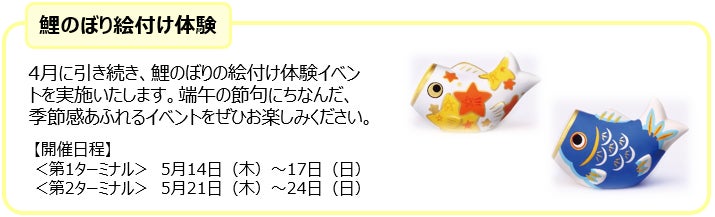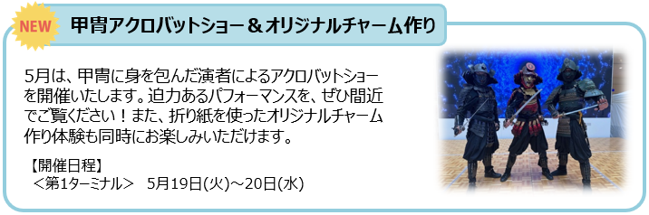 5月は「端午の節句」にちなんだイベントを開催いたします。国内外で活躍するアクロバット集団による甲冑アクロバットショーをはじめ、兜折り紙のオリジナルチャーム作りや、鯉のぼりの絵付け体験など、多彩なプログラムをお楽しみいただけます。