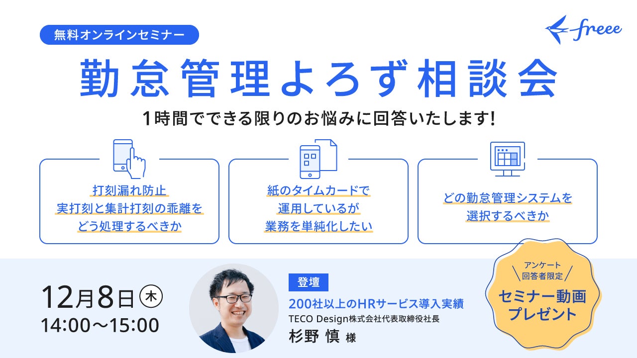 freee株式会社(本社:東京都品川区、CEO:佐々木大輔、以下「freee」)が提供する「freee人事労務」では、2022年12月8日(木)14時から、「勤怠管理よろず相談会」をオンライン無料開催します。200社以上のHRサービス導入実績のあるTECO Design株式会社代表取締役社長の杉野 慎 氏が、勤怠管理の効率化、属人化防止について課題を抱える人事担当者のお悩みにお答えします。
