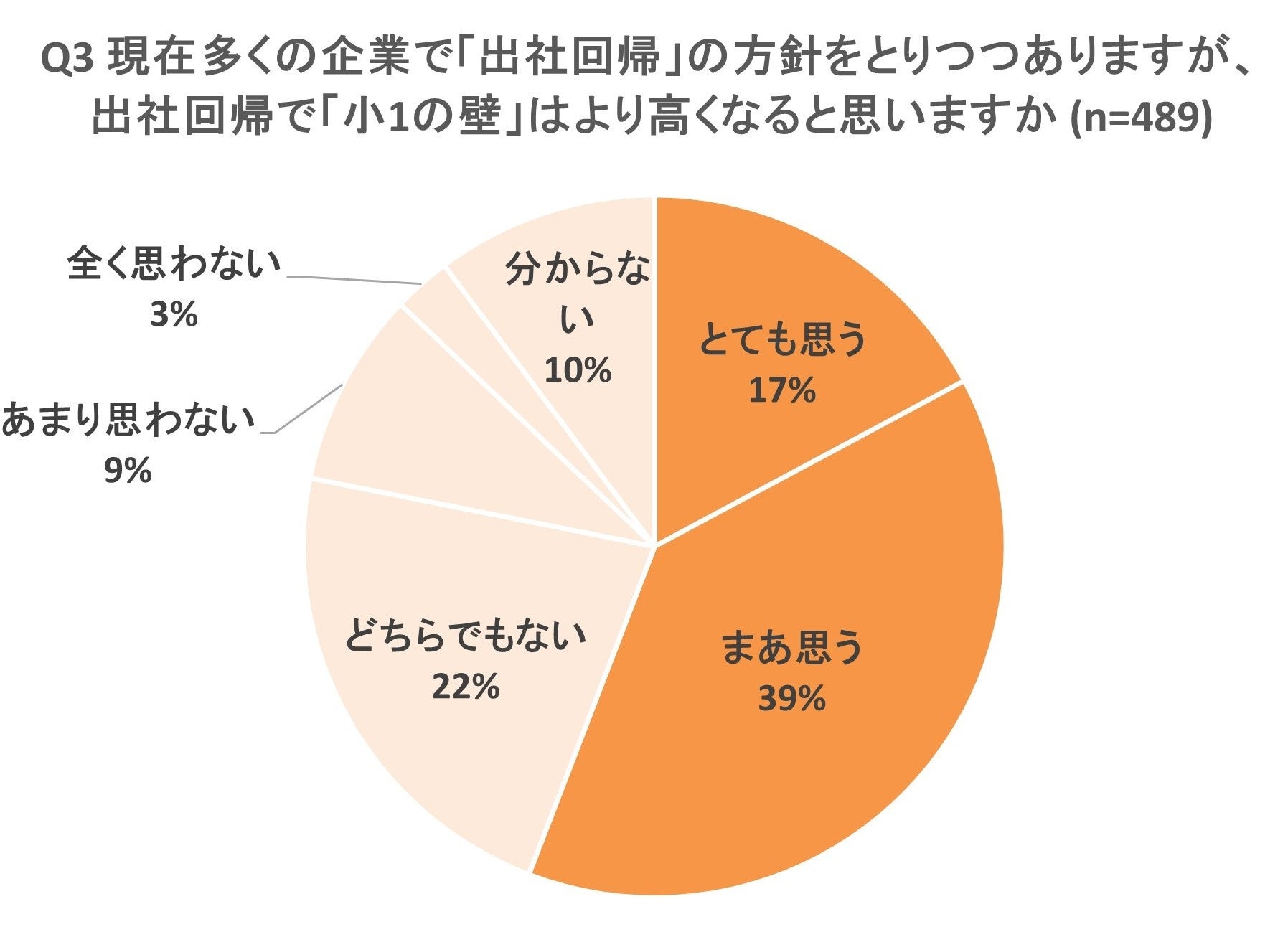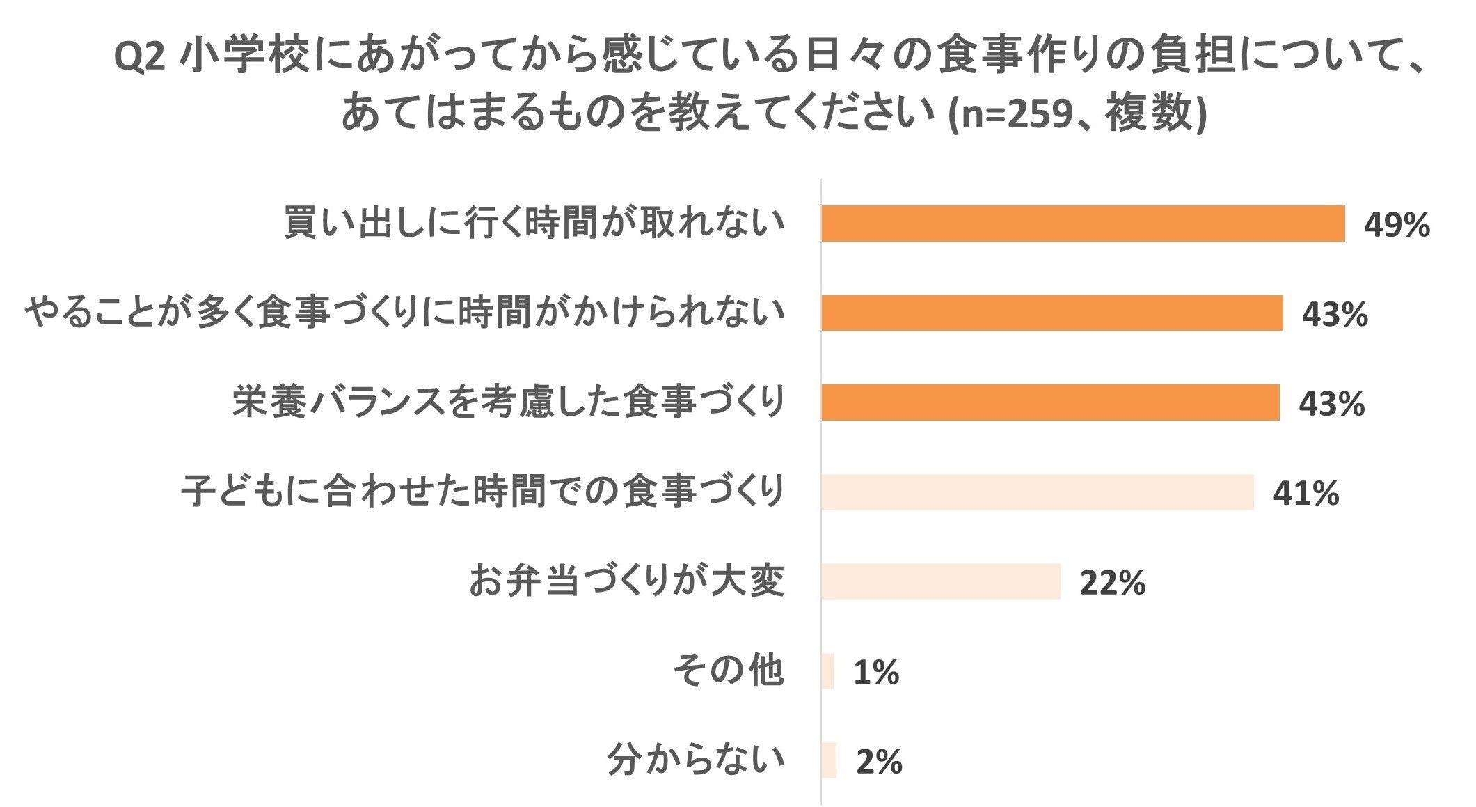 現在小学生の子供を持つ共働きの男女489名にアンケートを実施したところ、食事づくりの負担の変化を聞くと、53%が小学校にあがってから日々の食事づくりの負担が増えたと回答(Q1)。Q1で「負担が増えた」と回答した方に具体的に感じた負担を聞くと、49%が「買い出しに行く時間が取れない」、43%が「やることが多く食事づくりに時間がかけられない」「栄養バランスを考慮した食事づくり」と回答(Q2)。時間がないなかでも栄養バランスのよい食事をつくりたいという葛藤が明らかになりました。さらに、昨今進んでいる出社回帰の波で、56%が出社回帰で「小1の壁」がより高くなると思うと回答しました(Q3)。
