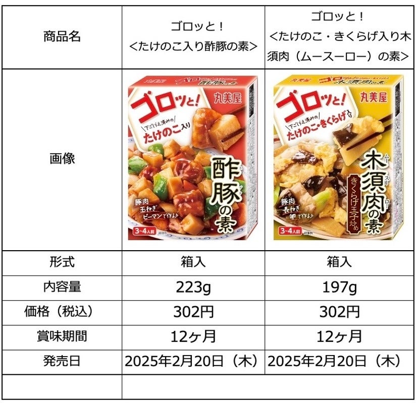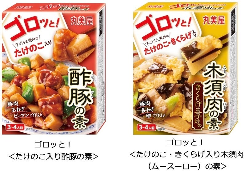 新しく発売する「ゴロッと! シリーズ」は〝ゴロッと〟大きめカットの具材が入っていることに由来します。本シリーズは「ゴロッと!<たけのこ入り酢豚の素>」と「ゴロッと!<たけのこ・きくらげ入り木須肉(ムースーロー)の素>」の2品です。 調理時の時短を実現しながらも味や栄養バランスなどには妥協したくないというニーズに応え、大人気中華メニューの酢豚と木須肉(ムースーロー) を家庭で手軽に楽しめる商品に仕上げました。丸美屋は今年もバラエティあふれる商品を投入し、日本中の食卓を豊かに彩ります。