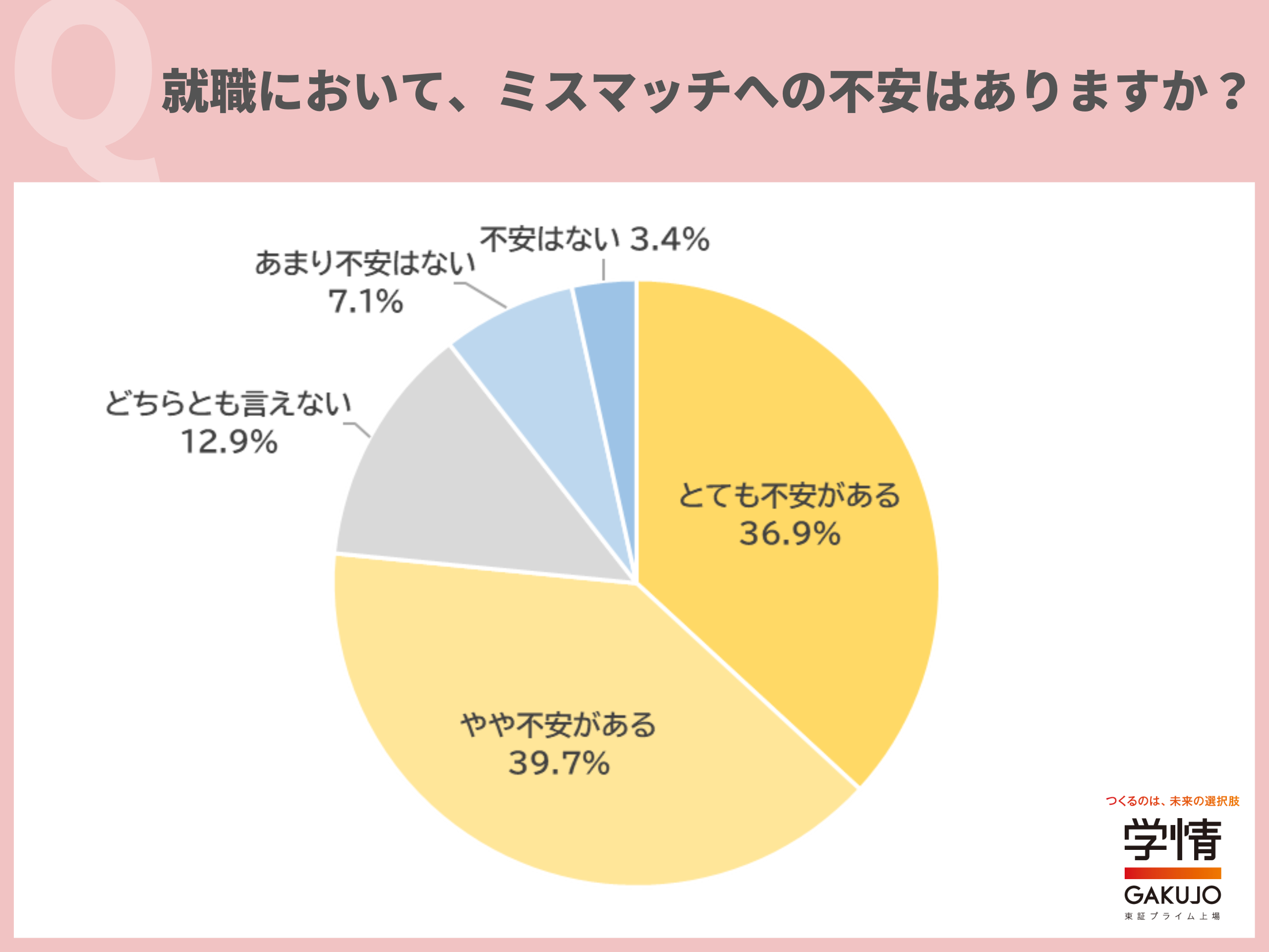 就職において、ミスマッチに「とても不安がある」と回答した学生が36.9%に上りました。「やや不安がある」39.7%を合わせると、8割に迫る学生がミスマッチに不安を抱いていることが分かります。「やりたい仕事と、適性のある仕事が合致しているかが分からない」「希望する部署に配属されるか分からない」「実際に入社してみないと分からないこともあると思う」「実際に現場で働いている社員と話せる機会が少ないと、社風をイメージしにくい」などの声が寄せられました。